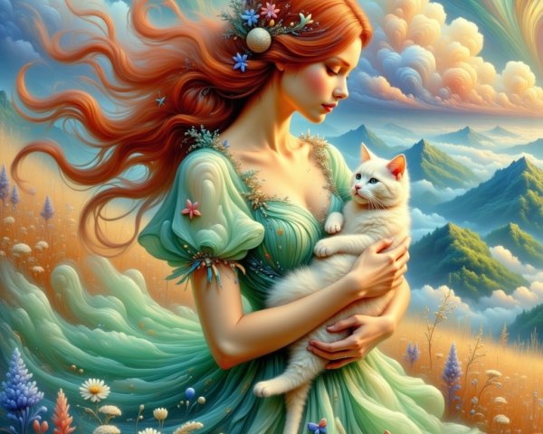 A digital artwork of a woman with vibrant blue hair and striking purple eyes against a colorful background with glowing balloons.