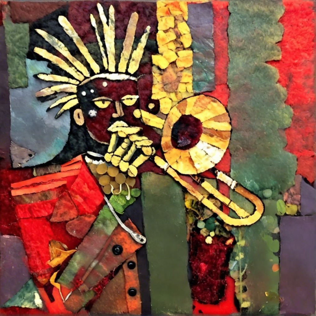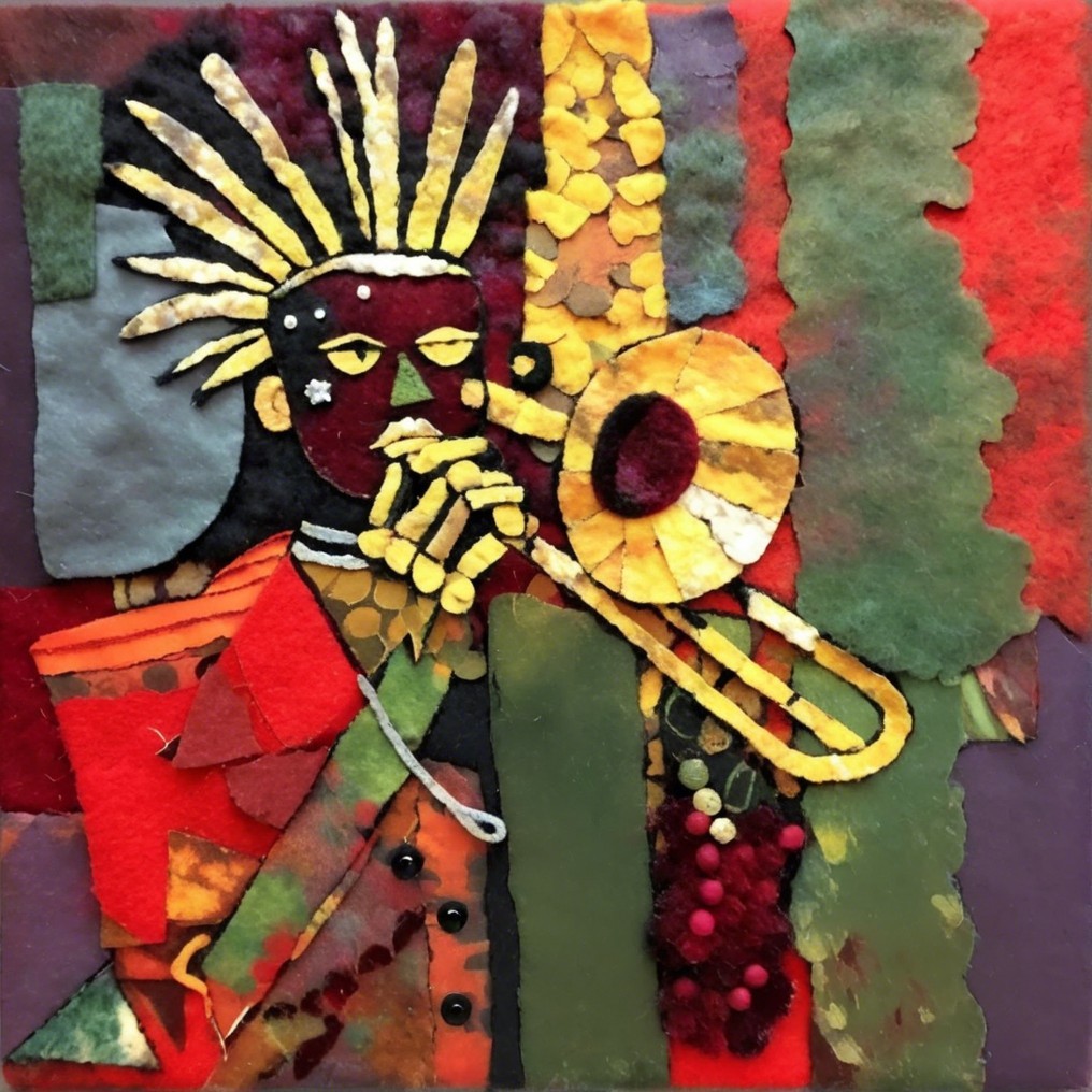 A vibrant felt collage portrays a jazz musician mid-performance. Constructed with layered textures and bold hues, the image radiates rhythm and cultural resonance, capturing the spirit of improvisation through textile abstraction and geometric forms.