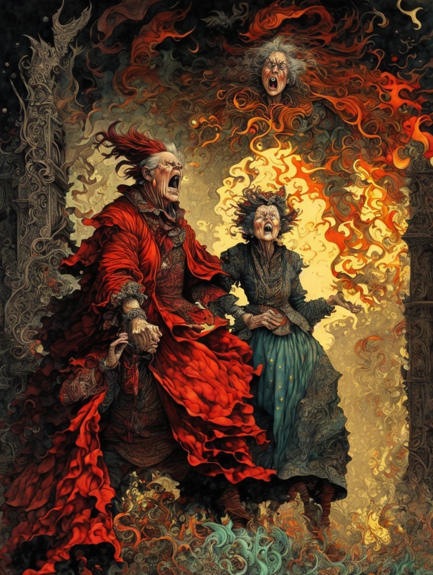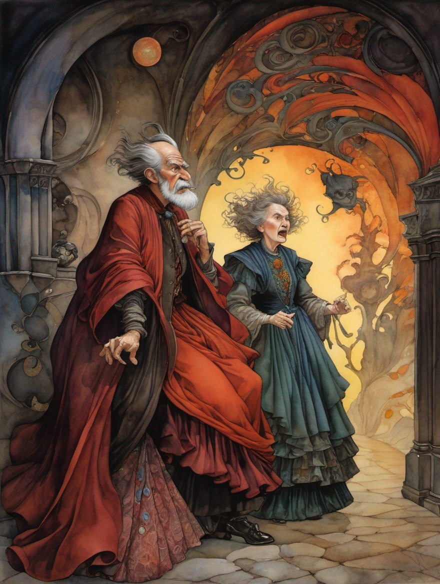 An illustration of an elderly wizard and companion in period attire, reacting with surprise or alarm, set against a fantasy castle backdrop at sunset.