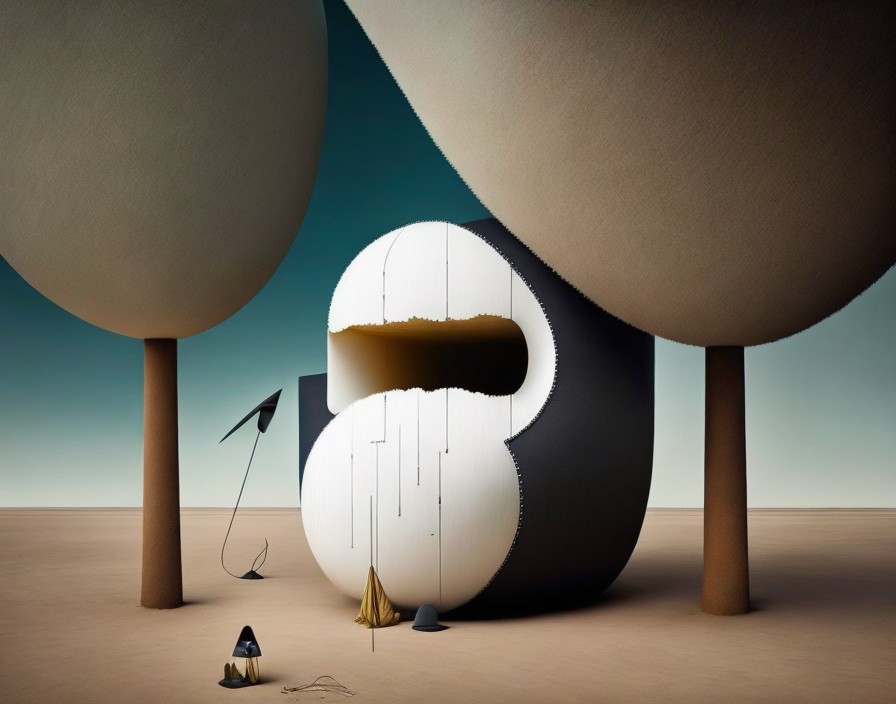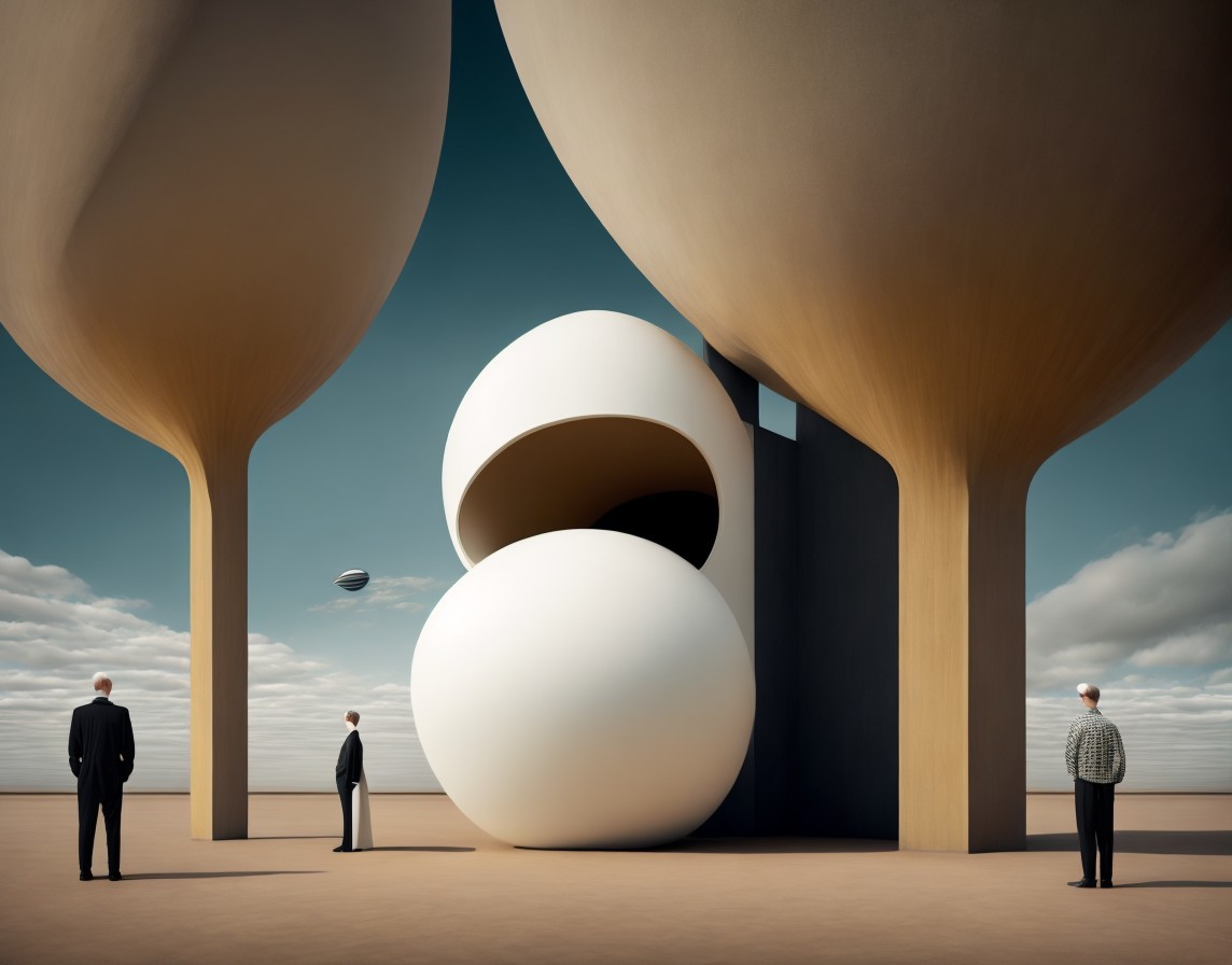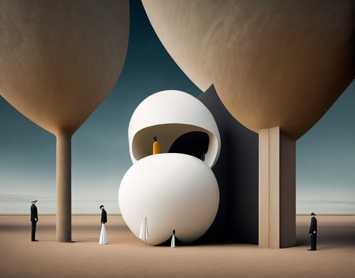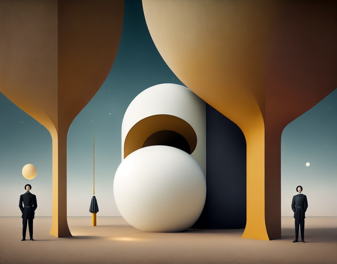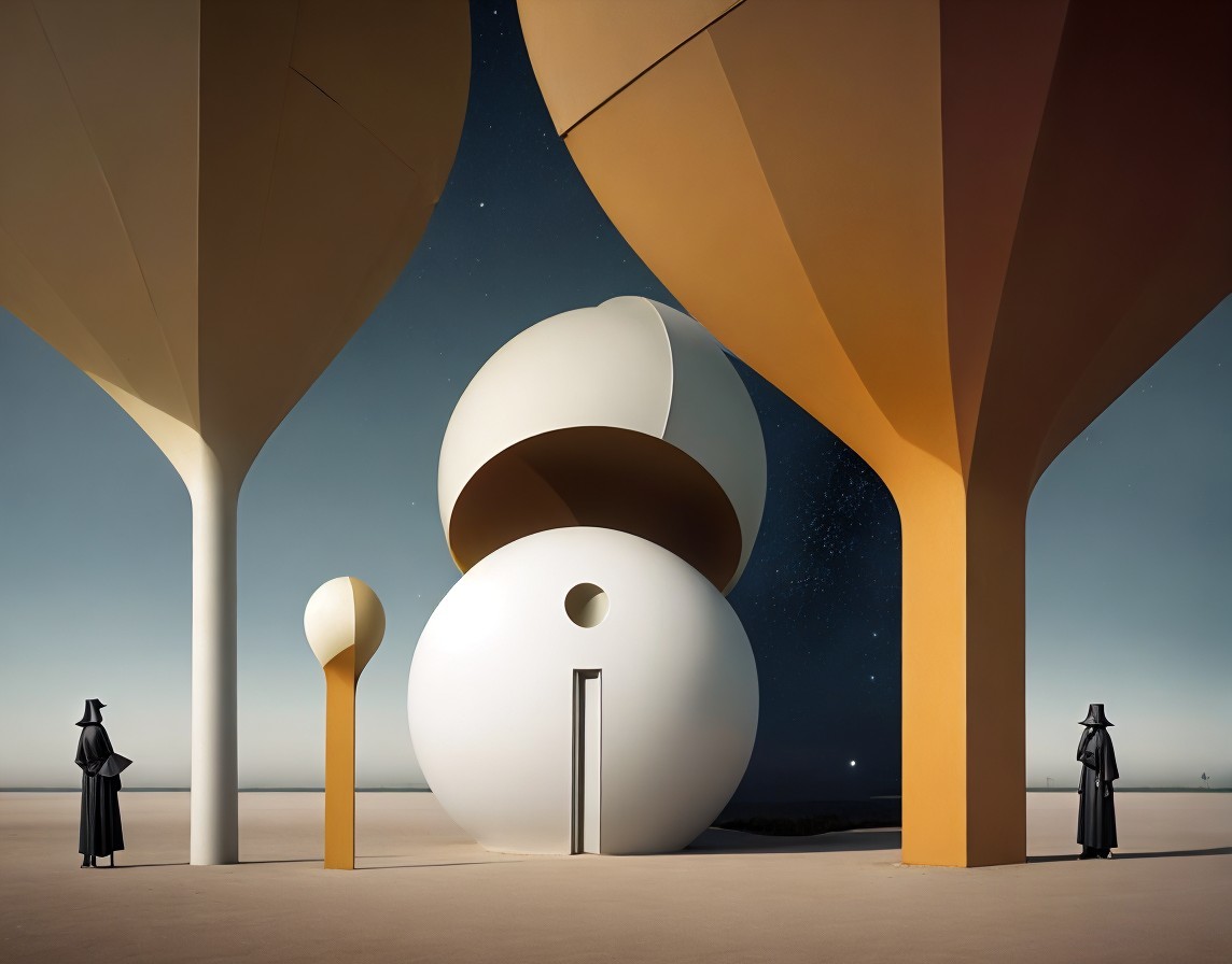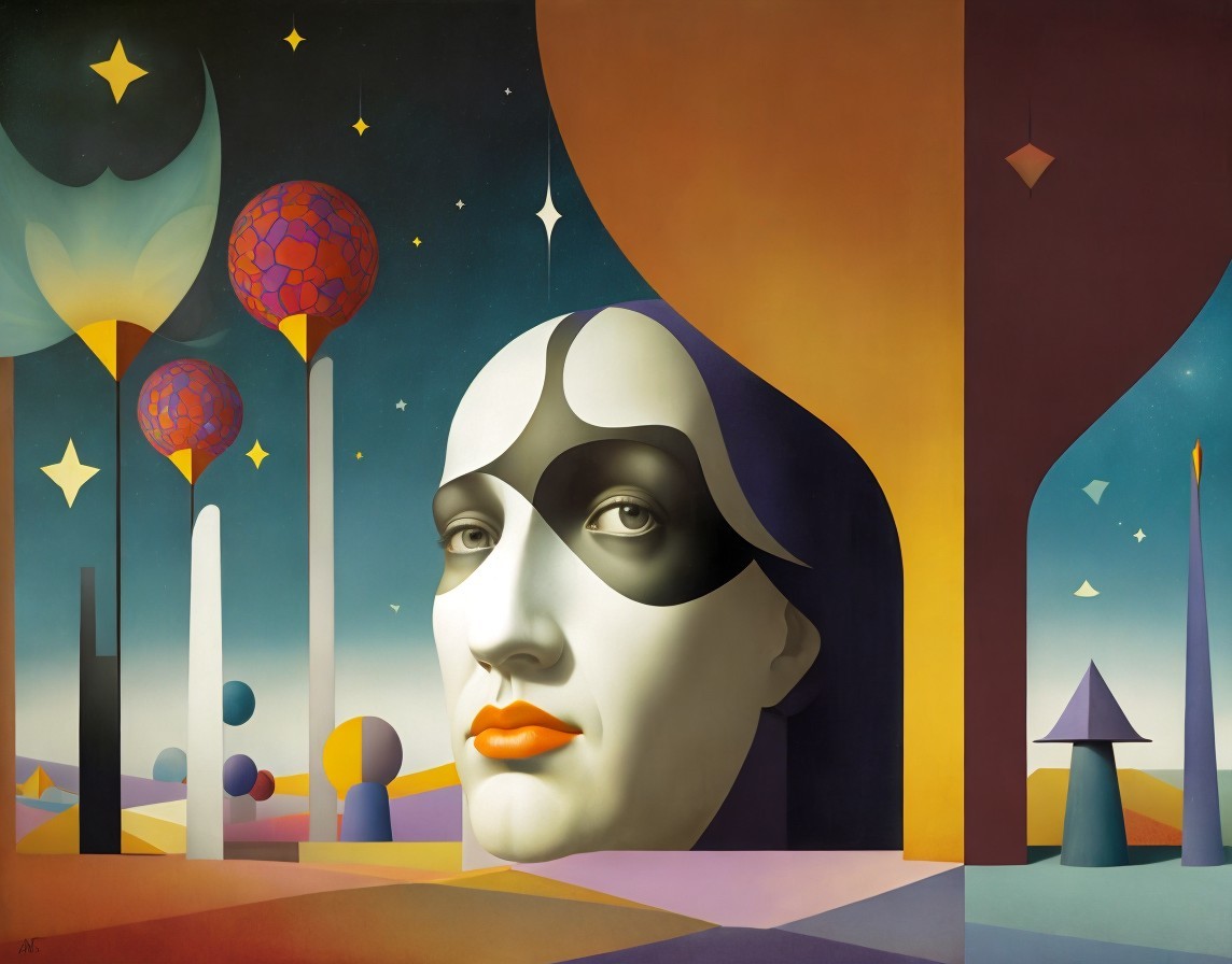 A stylized image featuring a surreal portrait integrated into an abstract geometric landscape with celestial elements.