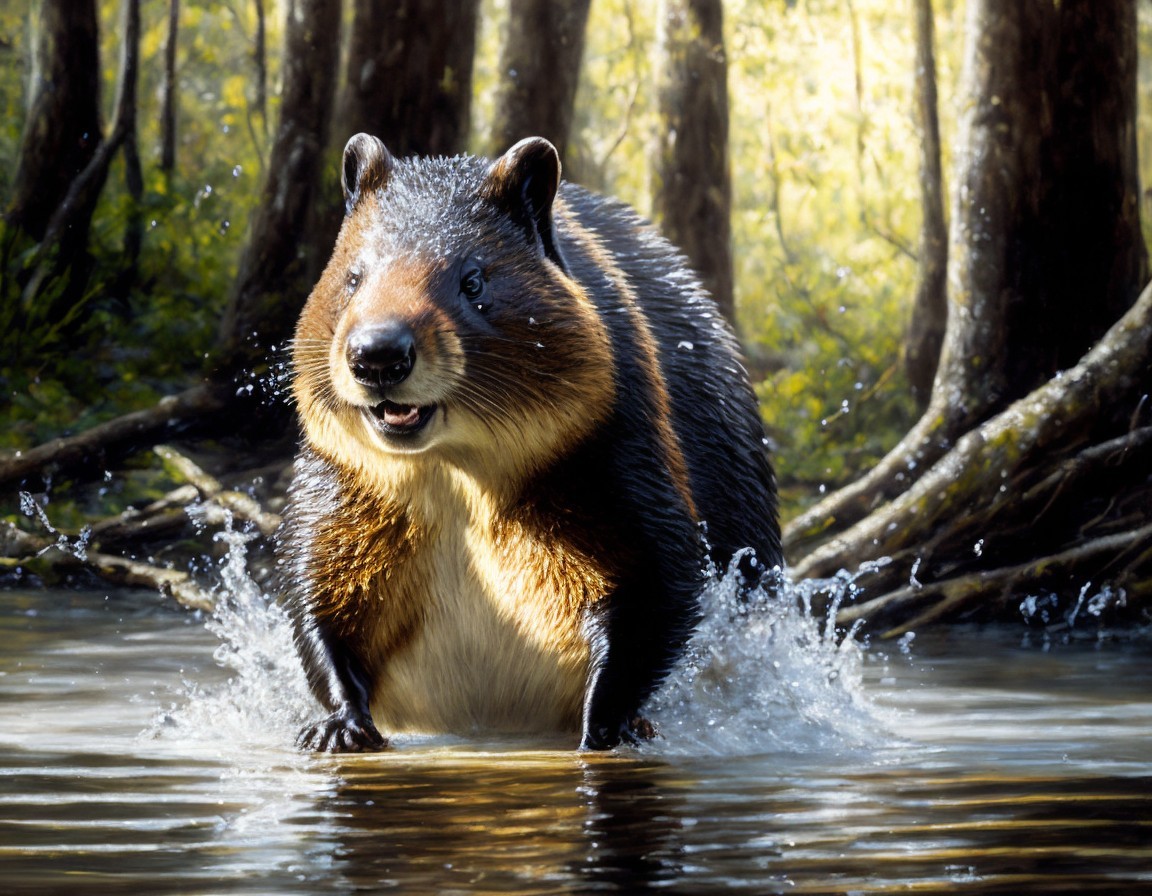 A photorealistic image of a beaver mid-splash in a forest stream, with sunlight filtering through the trees.