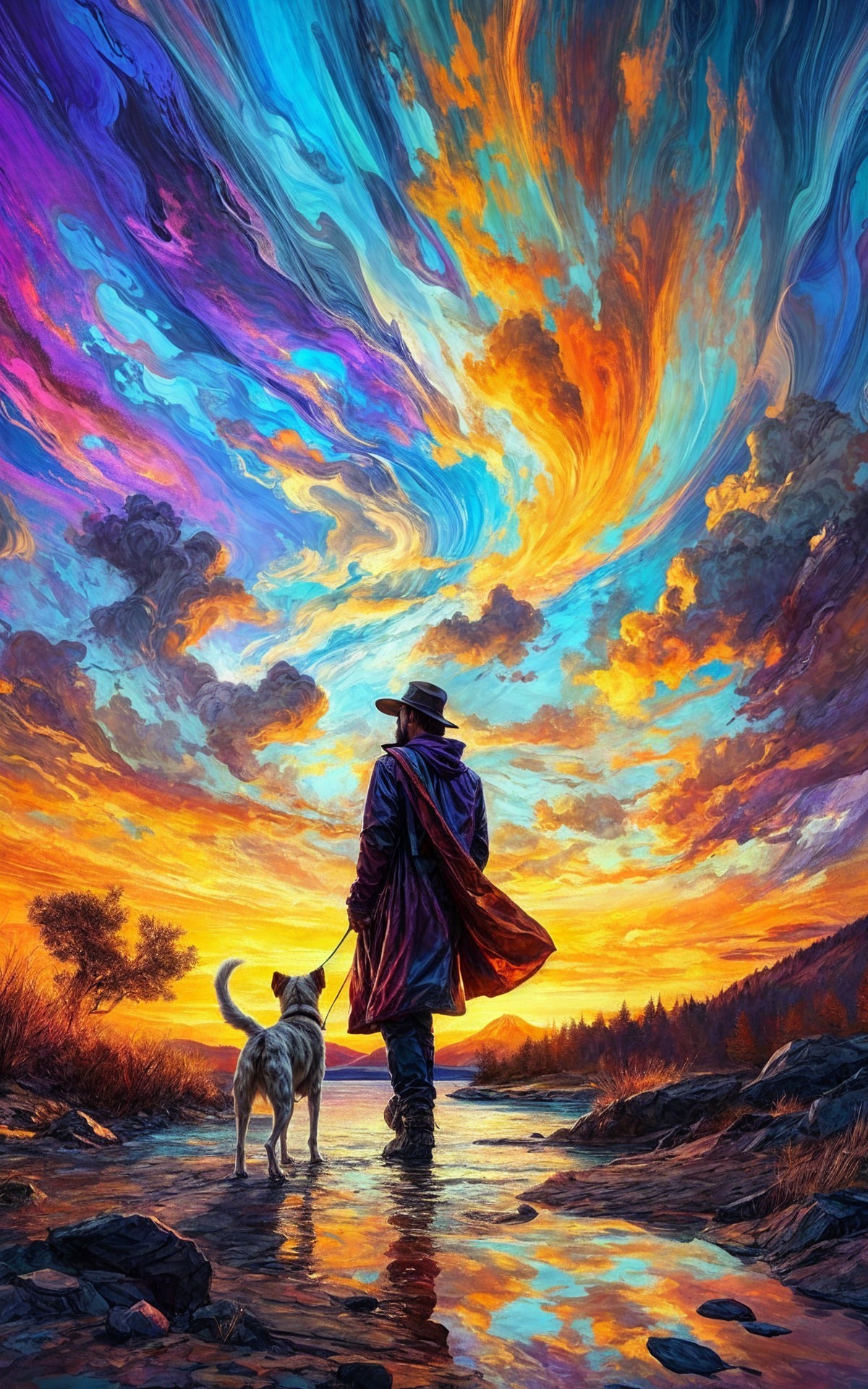 A figure walks a dog along a riverbank at sunset, surrounded by vibrant, swirling colors in the sky. The scene radiates warmth and serenity, capturing a moment of connection with nature.