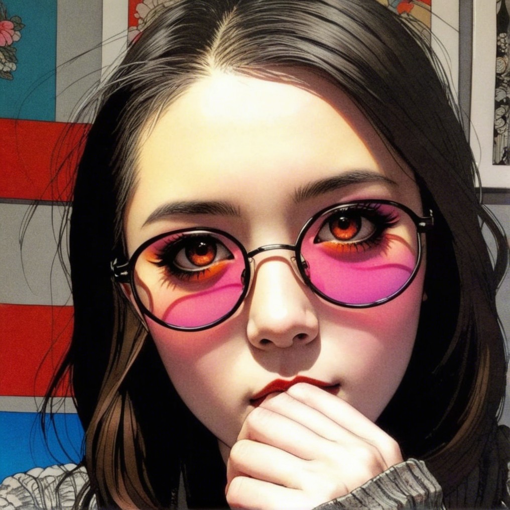 A close-up portrait of a woman with dark hair, wearing round pink-tinted sunglasses and a thoughtful expression. The background features colorful geometric patterns.