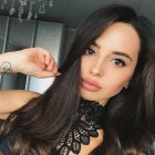 A close-up selfie of a woman with long, dark hair, elegantly styled makeup featuring bold eyes and nude lips. She wears a lace neck detail, exuding confidence and charm.