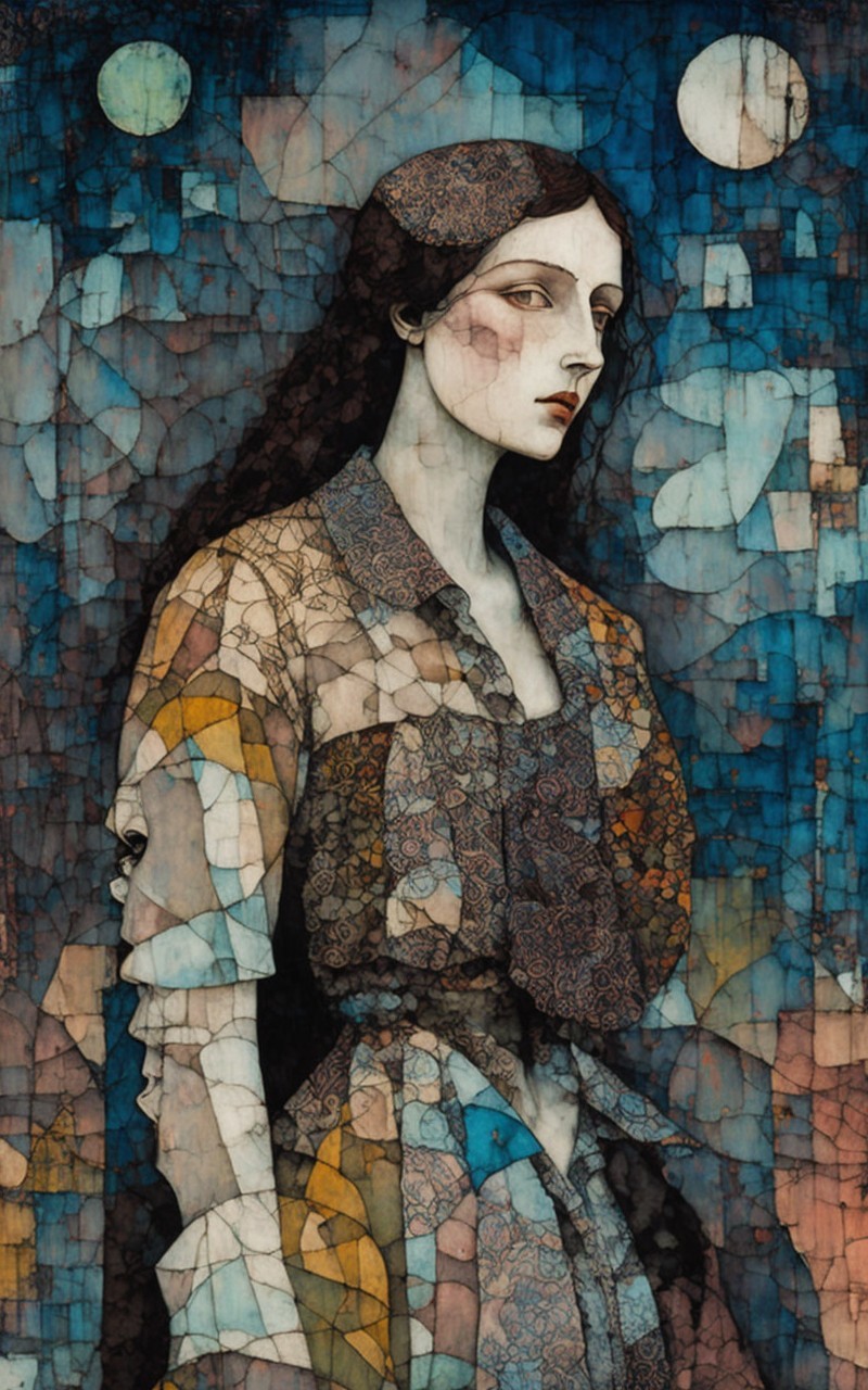 A woman in a trench coat blends with a geometric, blue-toned background, creating an artistic, seamless composition.