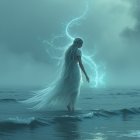 A figure in a flowing white gown stands in calm waters, surrounded by a misty landscape. Long, flowing hair cascades down her back, creating a serene and ethereal atmosphere.