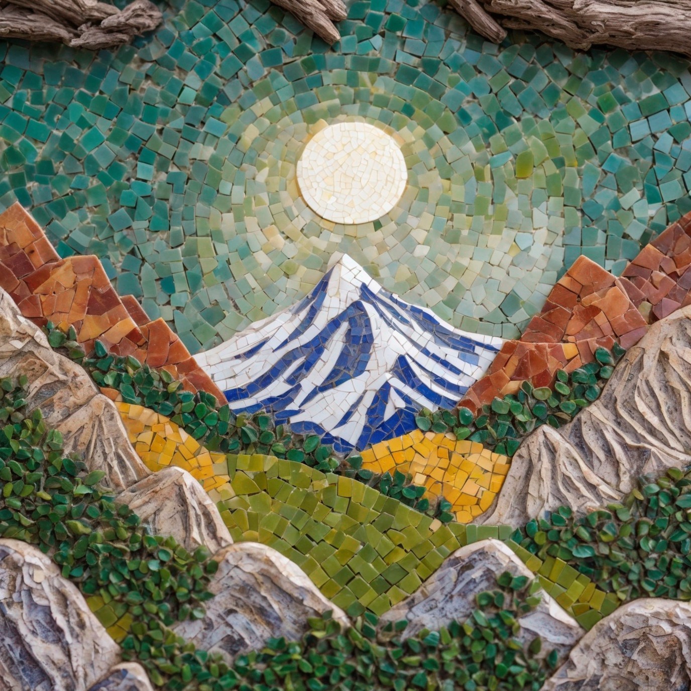 Prompt: Enhance vibrant colours! Beautiful sky.Ancient roman miniature tile mosaic of beautiful tree and moon and mountain, focused, closed up and imperial colorful