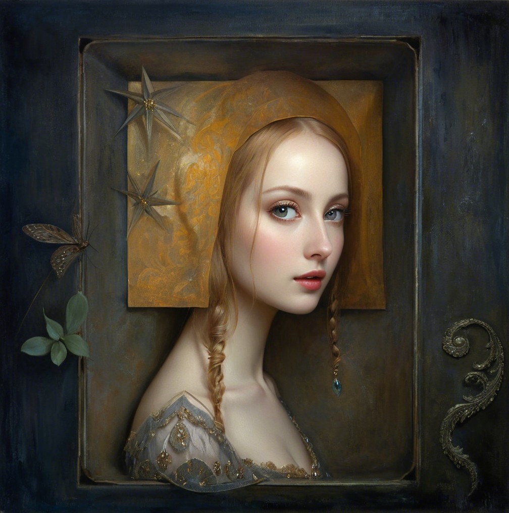 Prompt: I haven't lived life, I haven't lived love. Just bird's eye view from the sky above". Love is a fragile thread, woven through moments. This artwork amalgamates the artistic styles of Michael Parkes, chrysalis