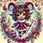 A whimsical character with vibrant blue hair and playful horn-like curls smiles warmly. Dressed in a festive outfit, she's surrounded by colorful candies in a snowy, cheerful landscape.