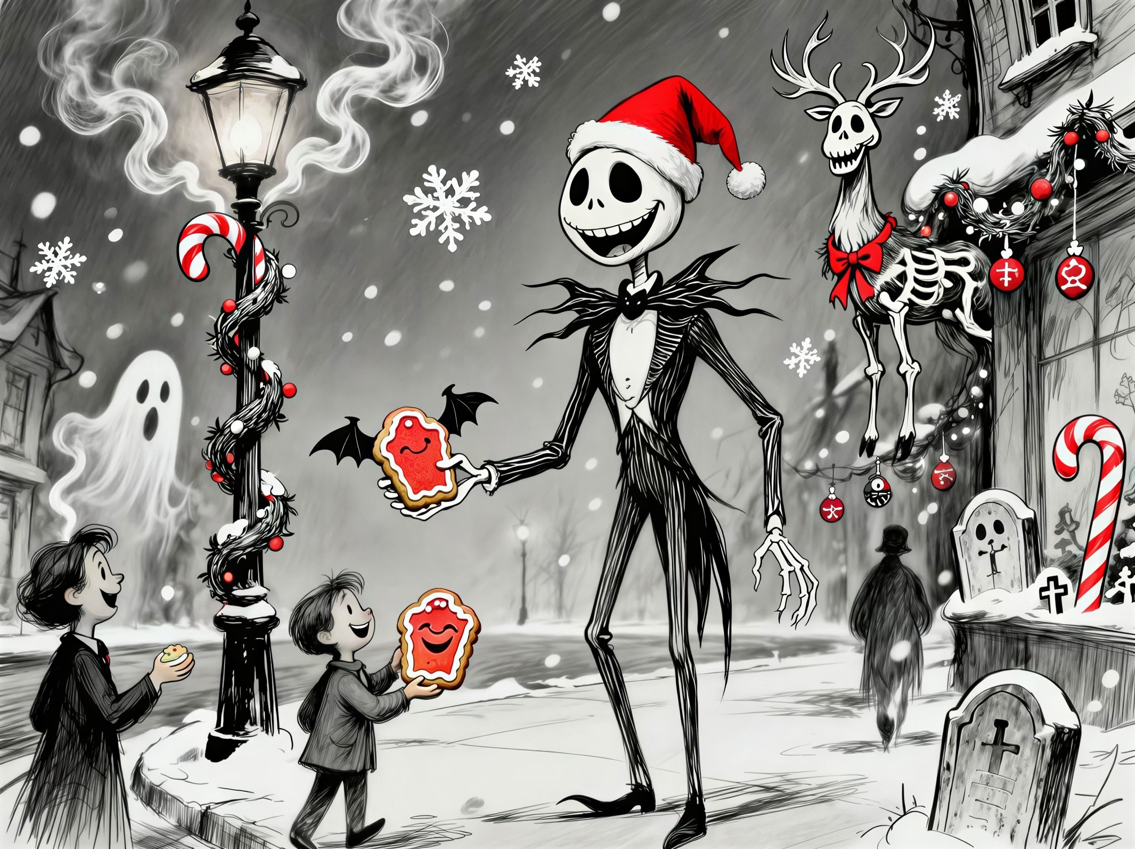 A greyscale painting shows Jack Skellington, wearing a Santa hat, handing out a bat-winged tombstone gingerbread cookie to a small boy. Jack has a wide, happy smile and is dressed in his pinstriped suit. A smiling girl stands in line ready to get her cookie from Jack.