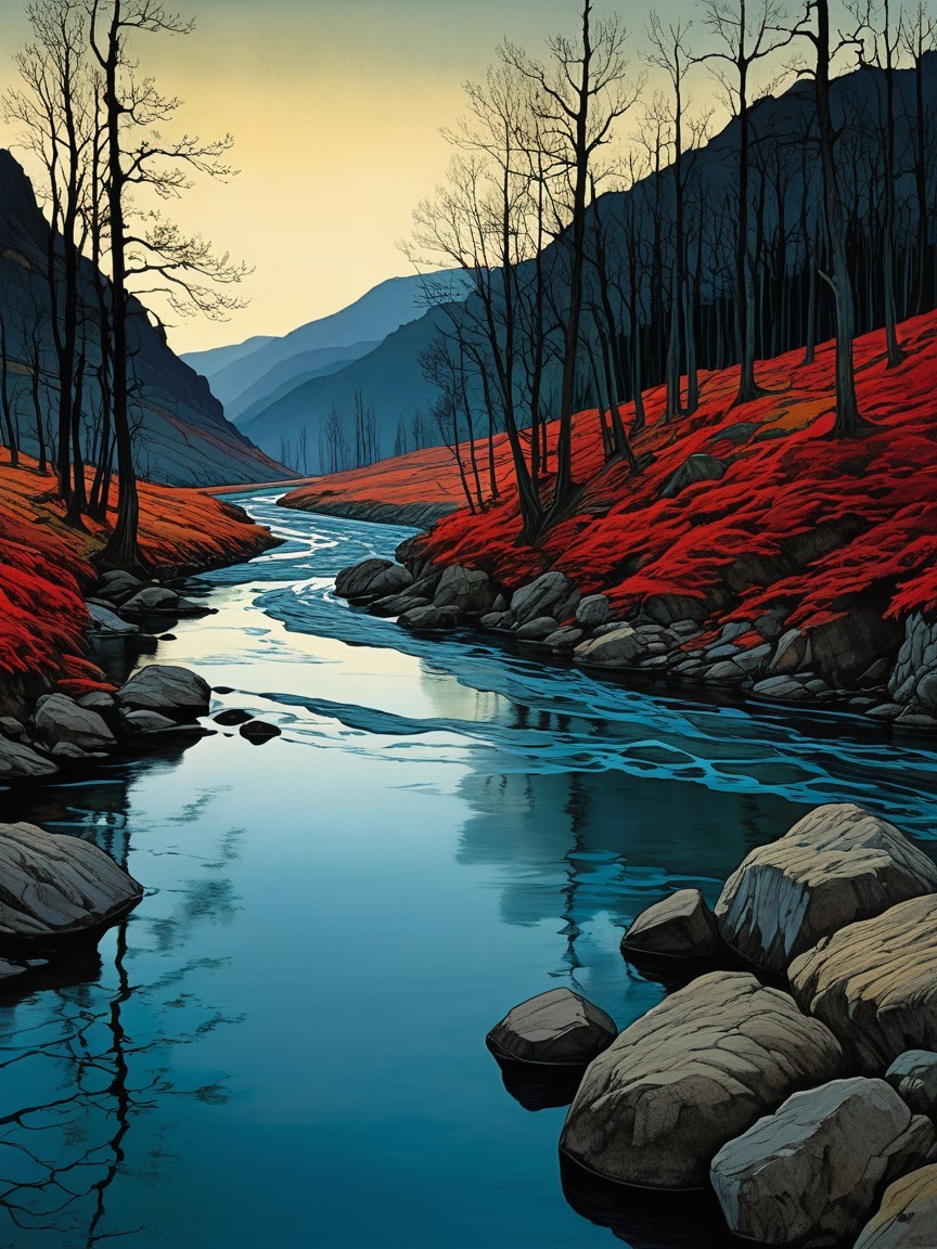 A serene landscape featuring a winding river reflecting the sky, surrounded by vibrant red foliage and dark silhouettes of trees against majestic mountains in the background.