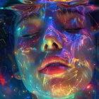 A serene portrait of a person submerged in colorful water, with shimmering reflections creating a mystical aura. Their skin glistens, and soft light enhances the tranquil atmosphere.