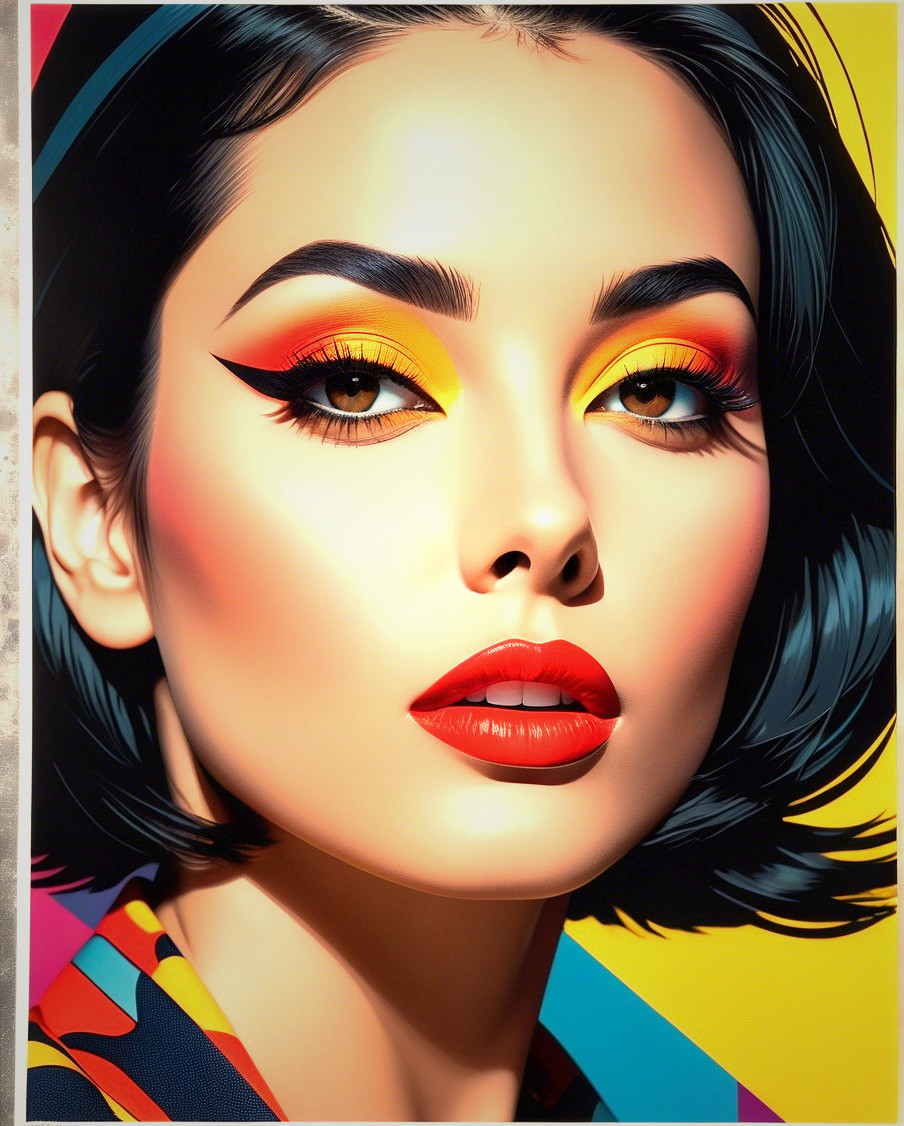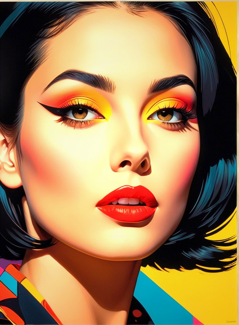 + Prompt:Vibrant, expressive pop-art female portrait, bold and abstract, halftone textures, grain, dappled lighting, parallax occlusion 1.3, angled view showcasing black shaggy hair, seductive expression, matte obsidian eyeshadow, sleek, inspired by Roy Lichtenstein and Man Ray, color glitch aesthetics, sensually abstracted, with fluid lines and skin-toned gradients. Set against a colored background with rim lighting, featuring erotic abstraction and surrealism, ethereal atmosphere. Incorporate warped reflections, luminous elements, fabric textures, and plasticity. Utilize dynamic lighting effects, ambient occlusion for depth, and hues inspired by Brad Kunkle. asymmetrical mixed media art envisioning an abstract dark fantasy inspired by Ilya Zomb, wet-on-wet technique for a textured appearance, fine-line style in awesome tessellated industrial design with a stylized linework, simply illustrative, gouache coloring reminiscent of Ho Baron's style, fine-line art, indiecore and pulp-art, angled, metallic coloring accents, wavery dappled lighting, zentangle, rim lighting, otherworldly ambiance with hatching, colorful hues by Overton Loyd and Ho baron, subtle luminism and extreme variety of colors, slightly sculpted, flowing hair illusion, subsurface scattering, raytraced shadows, visible textures, bokeh, --ar 1:1 --q 2 --s 750, brightened color palette, pointilism, ethereal atmosphere, layers of fabric blend with turbulent flares, liminal hues by Ho Baron and Man Ray, lighting by Ed Paschke, wavery texture patchwork, pellucid details, juminocore elements, grunge aesthetic, fusion art concept, precise Gelsculp illuminated by harsh lighting, 1970's vintage cartoon, linework estheticstextures, painterly style with heavy brushstrokes by Brandon Mably, dyed, subsurface scattering 1.3, parallax occlusion 1.3, raytraced shadows 1.3,
