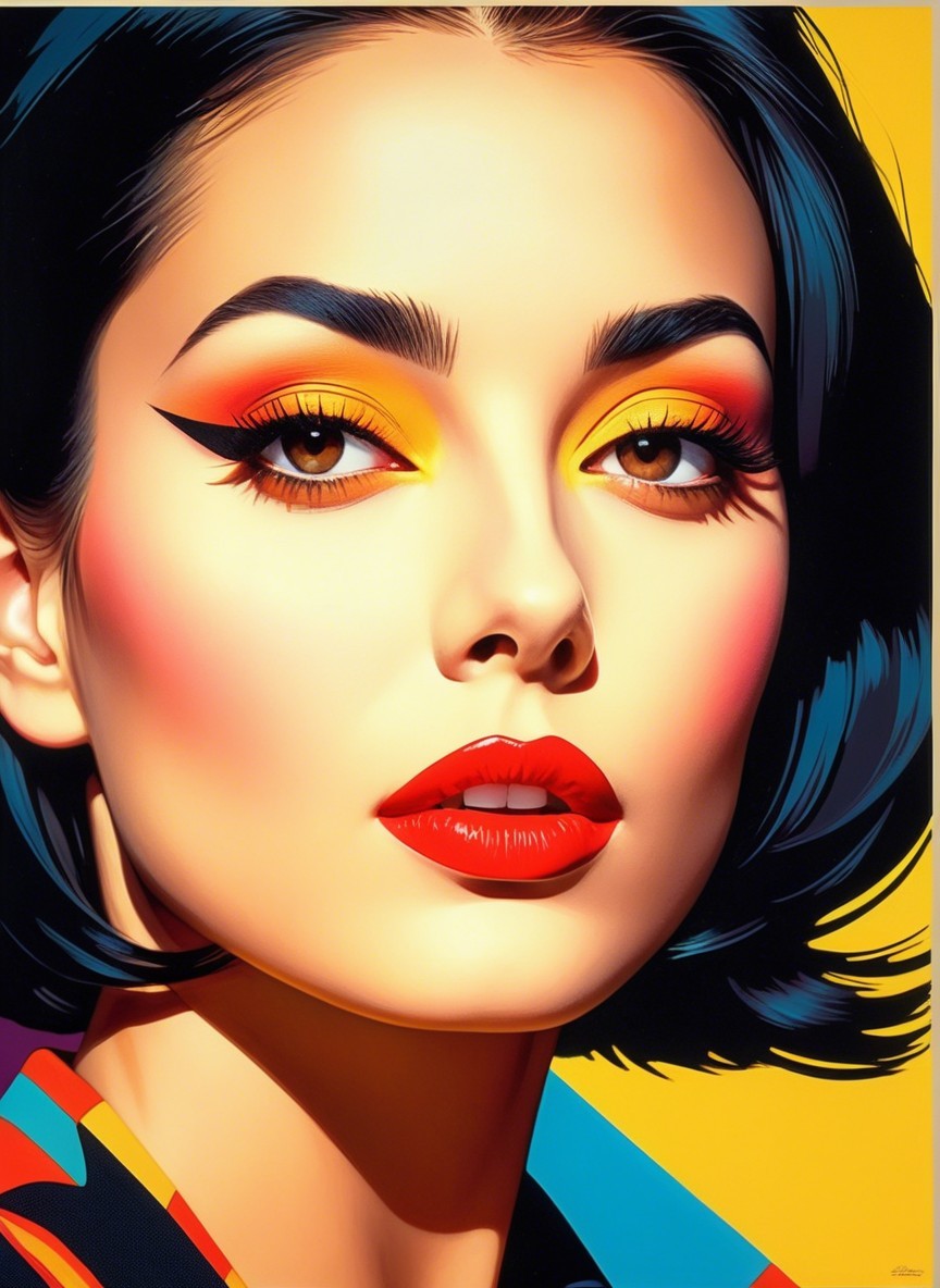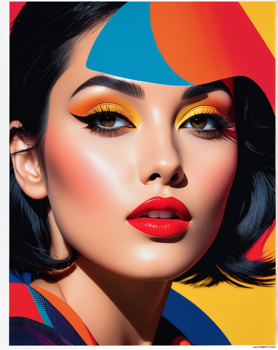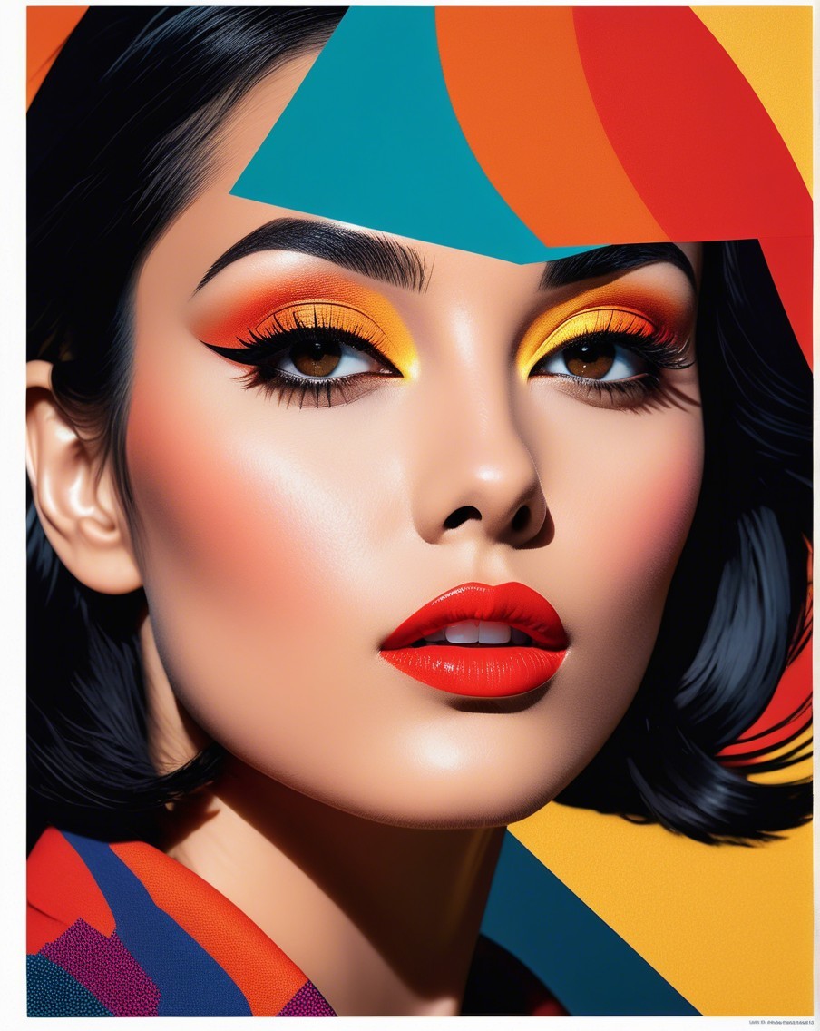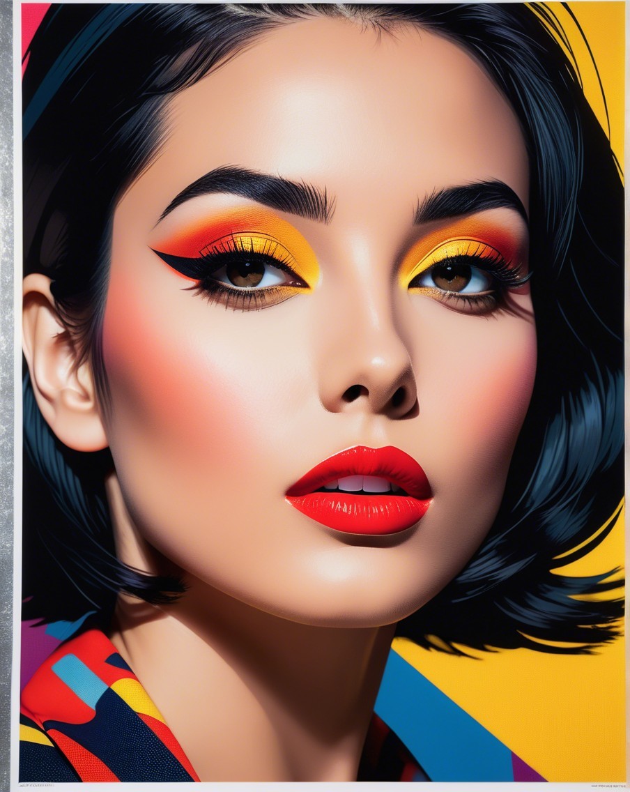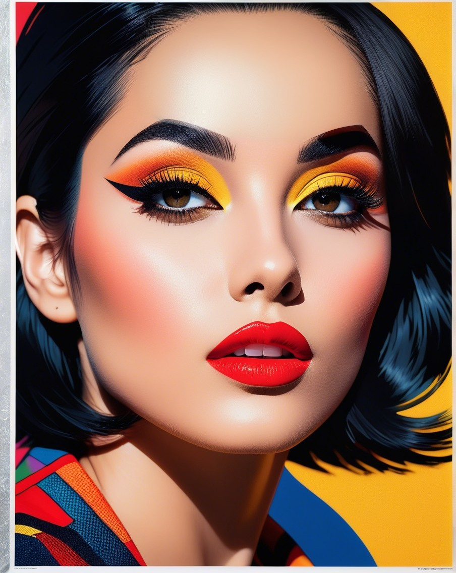 A striking portrait of a woman with bold makeup: vibrant yellow and orange eyeshadow, defined eyeliner, and lush red lips. Her short, dark hair contrasts against a colorful background.
