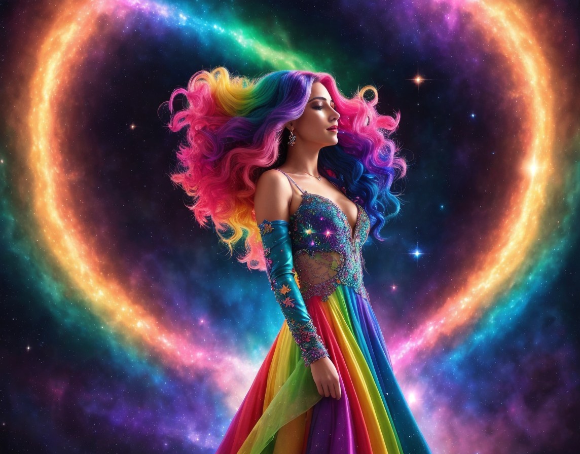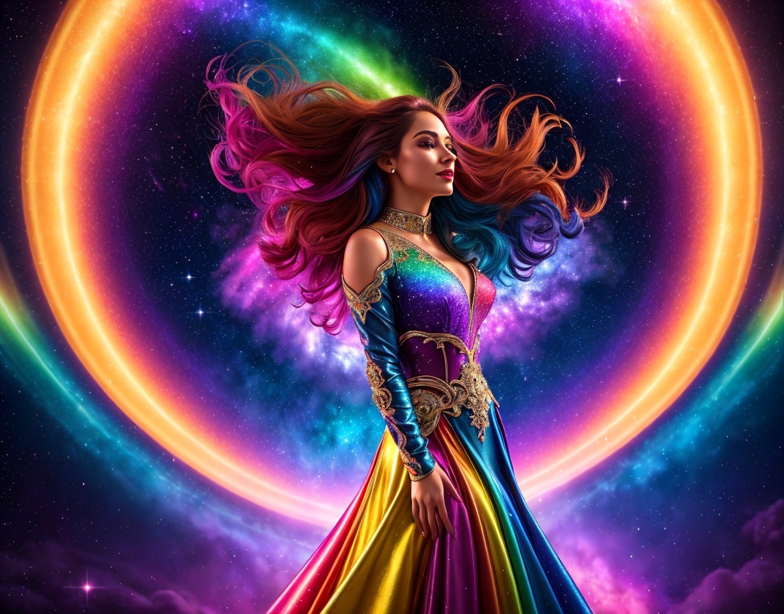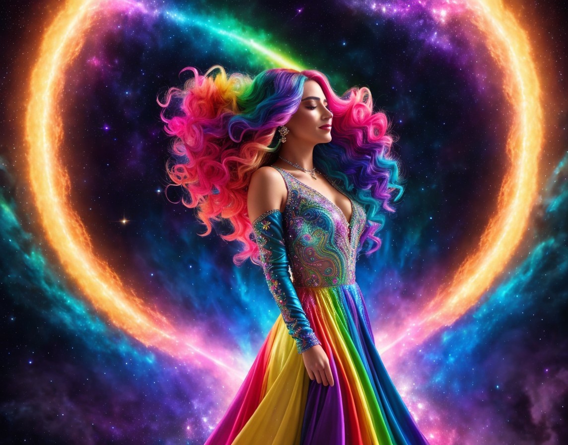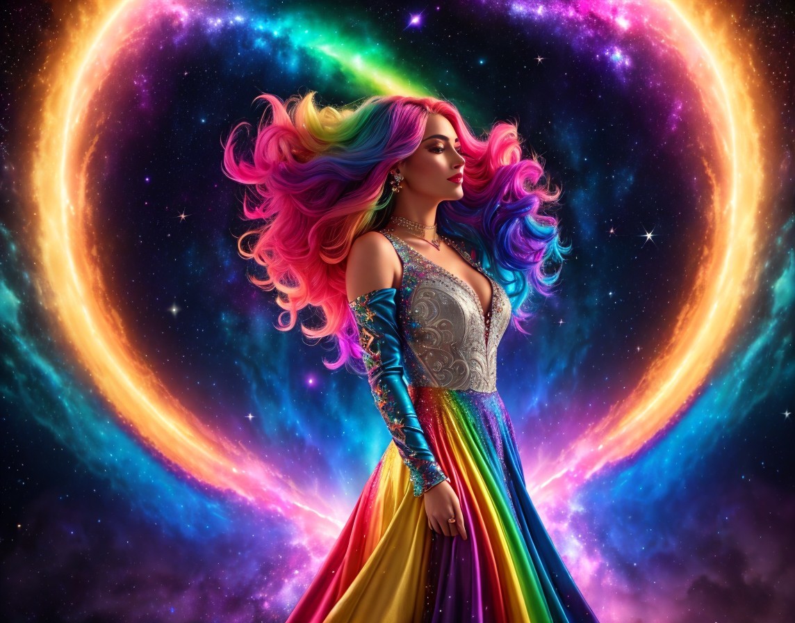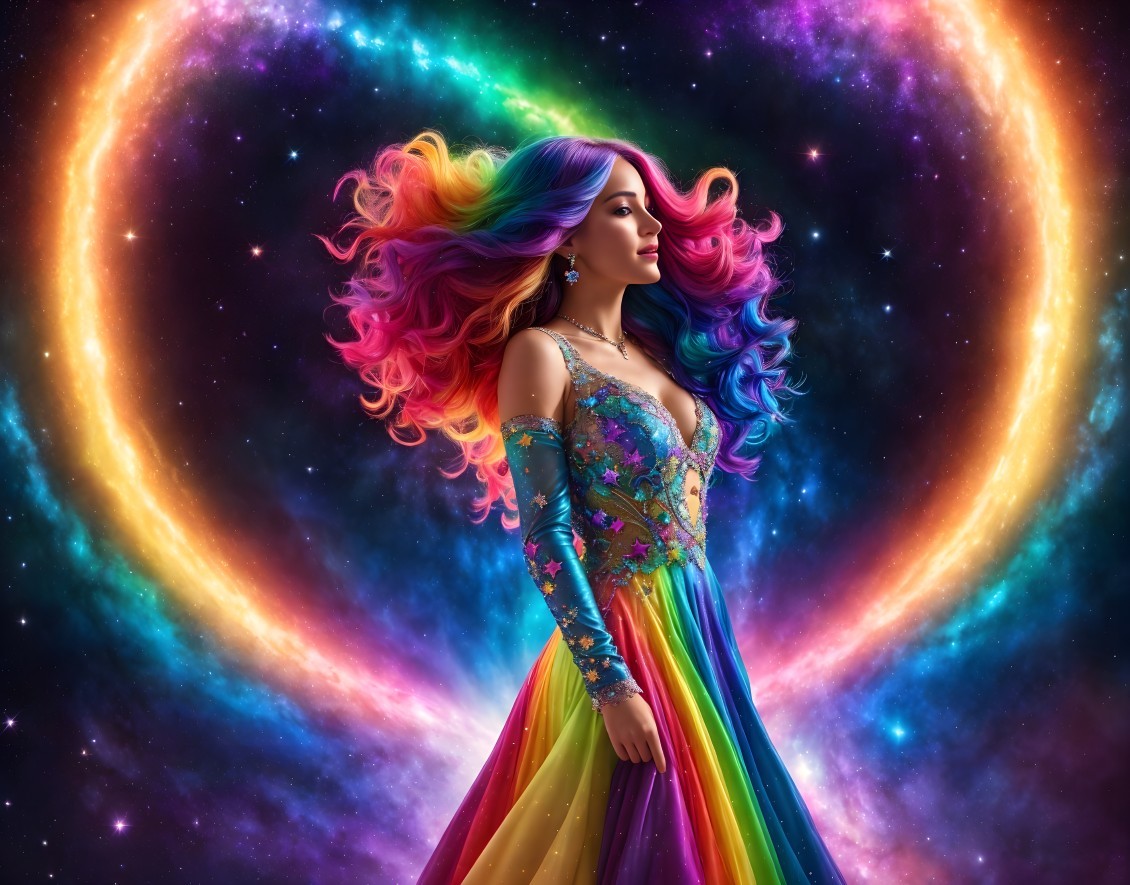 A femme figure manifestation of trans joy exploding out of a rainbow galaxy, lace multi-coloured dress, see through translucent lace top, rainbow hair flowing into cosmic electricity, lots of colourful stars and galaxies in background.