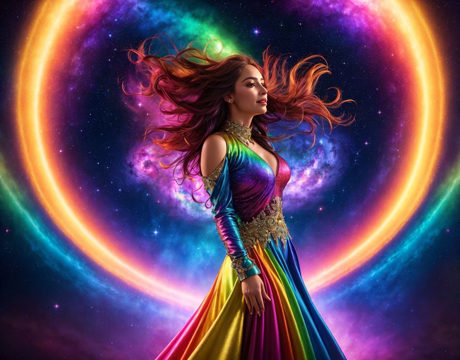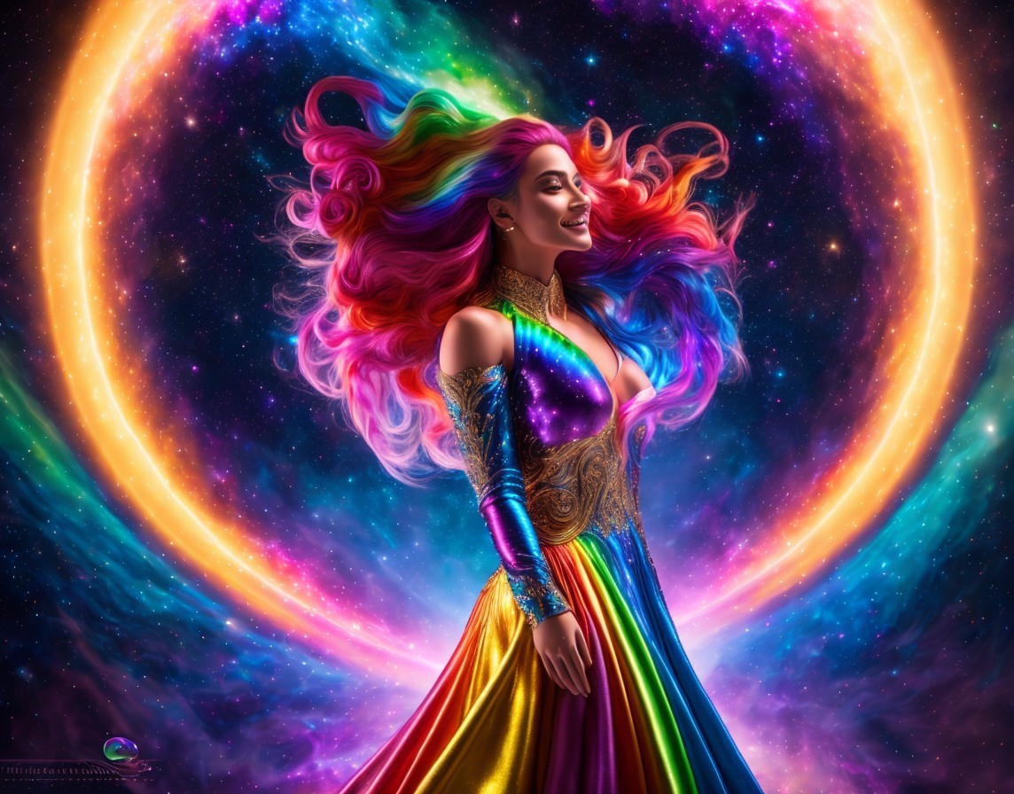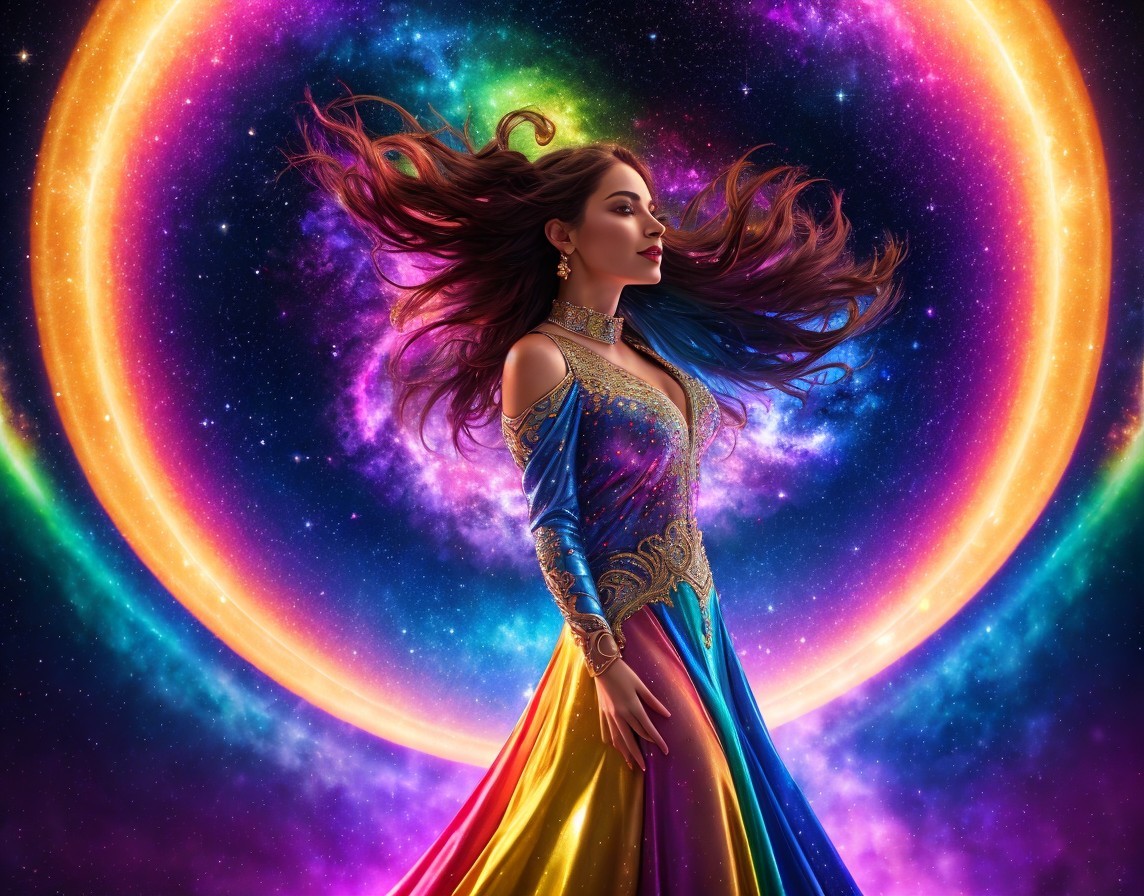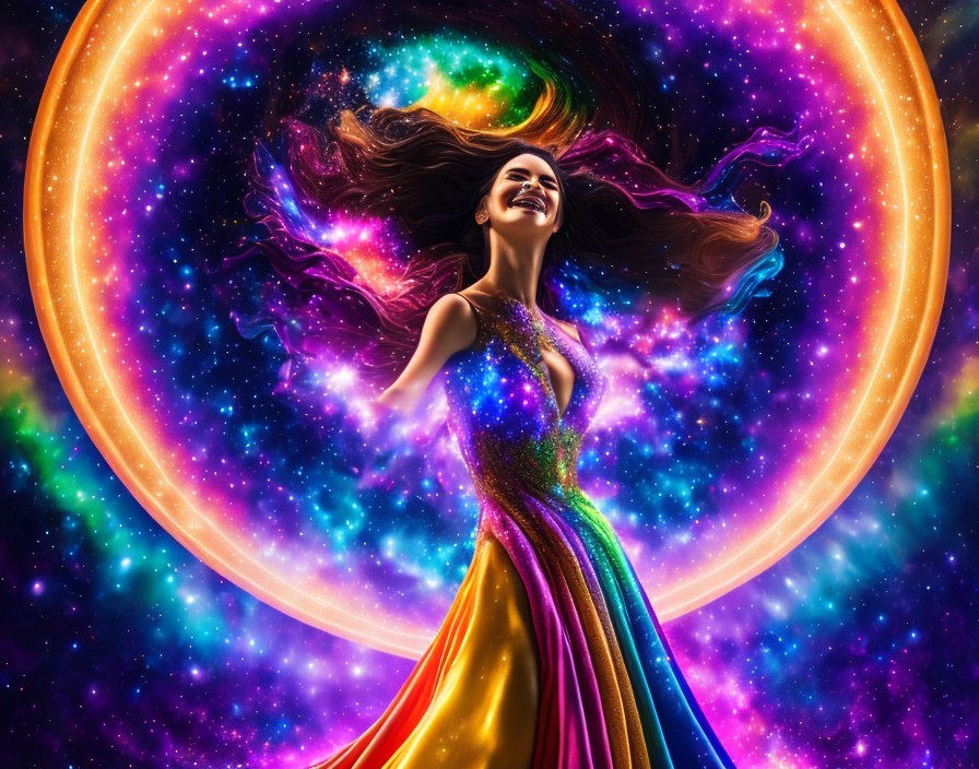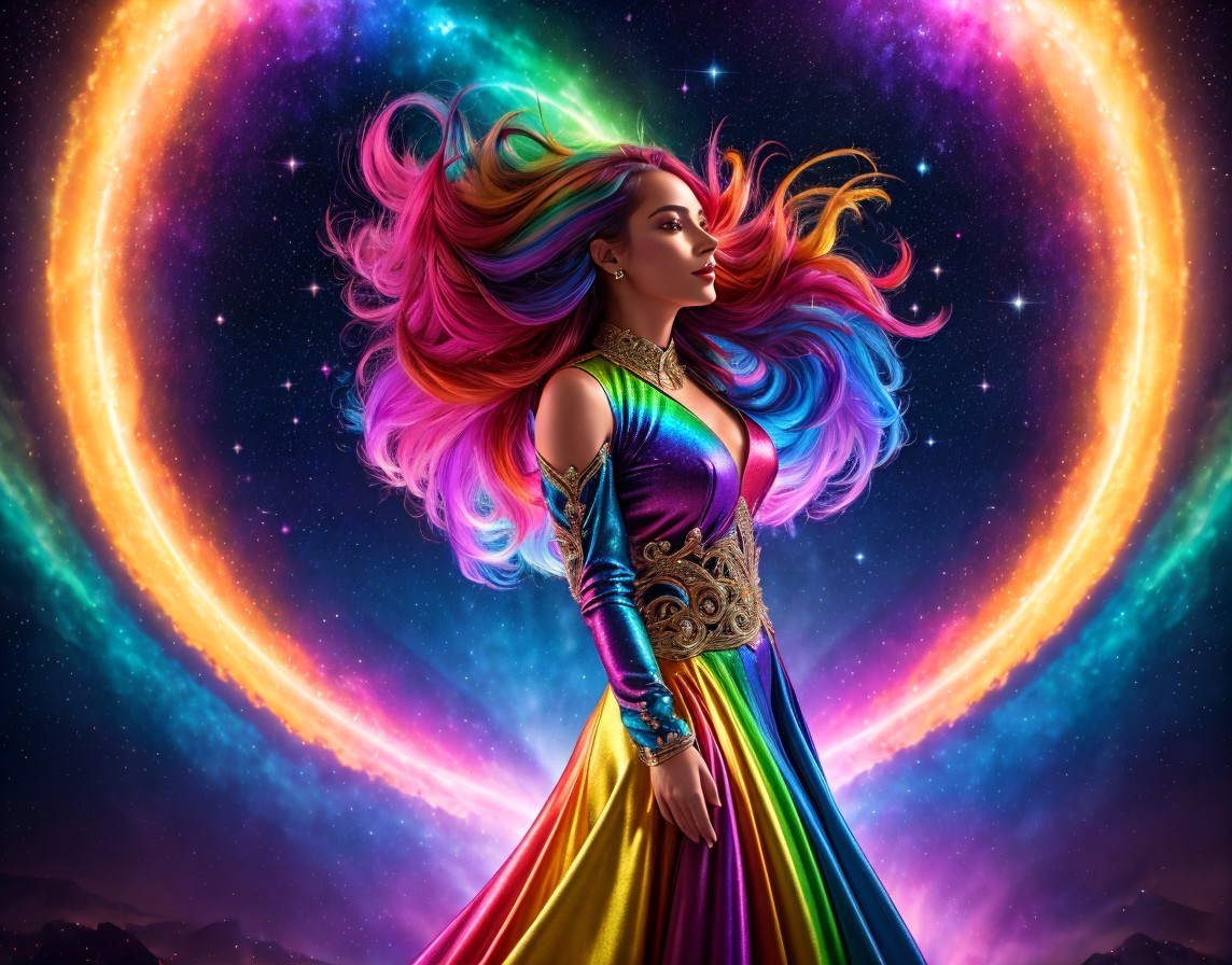 A femme figure manifestation of trans joy exploding out of a rainbow galaxy, lace multi-coloured dress, see through translucent lace top, rainbow hair flowing into cosmic electricity, lots of colourful stars and galaxies in background.