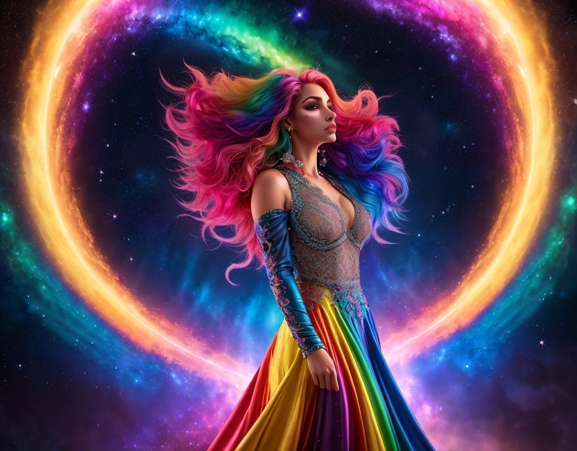 Prompt: A femme figure manifestation of trans joy exploding out of a rainbow galaxy, lace multi-coloured dress, see through translucent lace top, rainbow hair flowing into cosmic electricity, lots of colourful stars and galaxies in background.