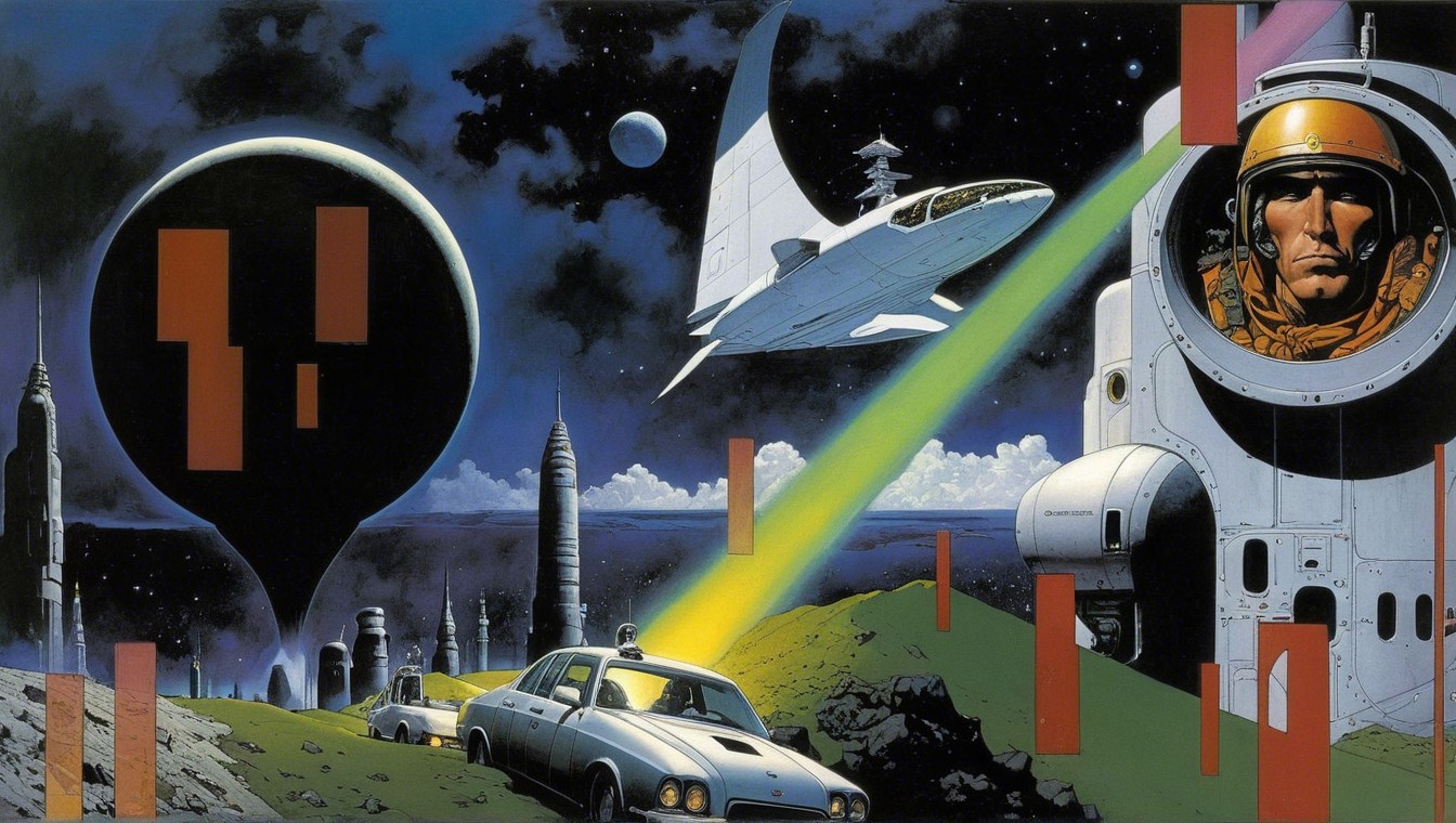 A futuristic scene featuring an astronaut beside a car, with a giant skull-shaped planet in the background. Rockets and a sleek spacecraft hover, set against a surreal, starry landscape.