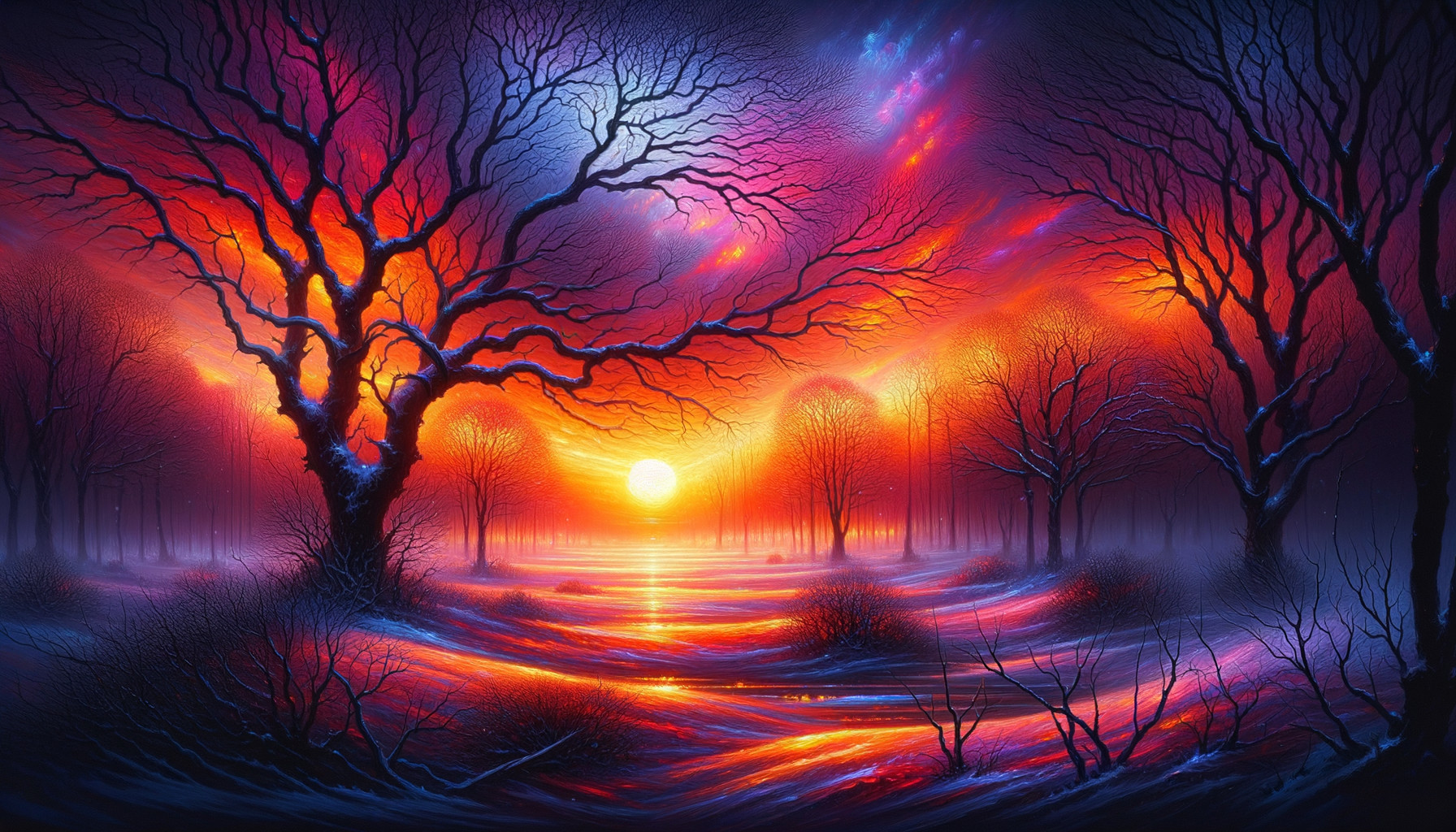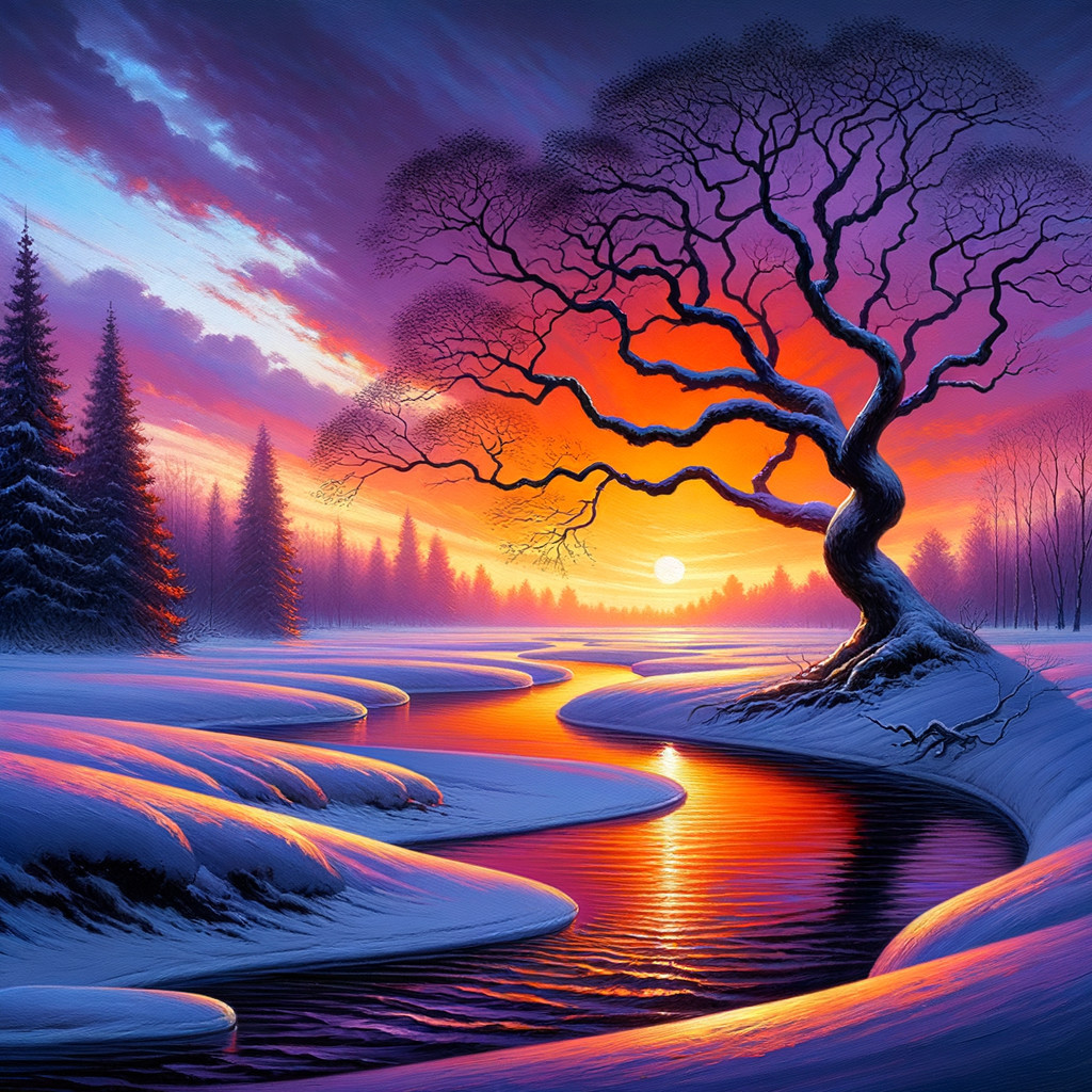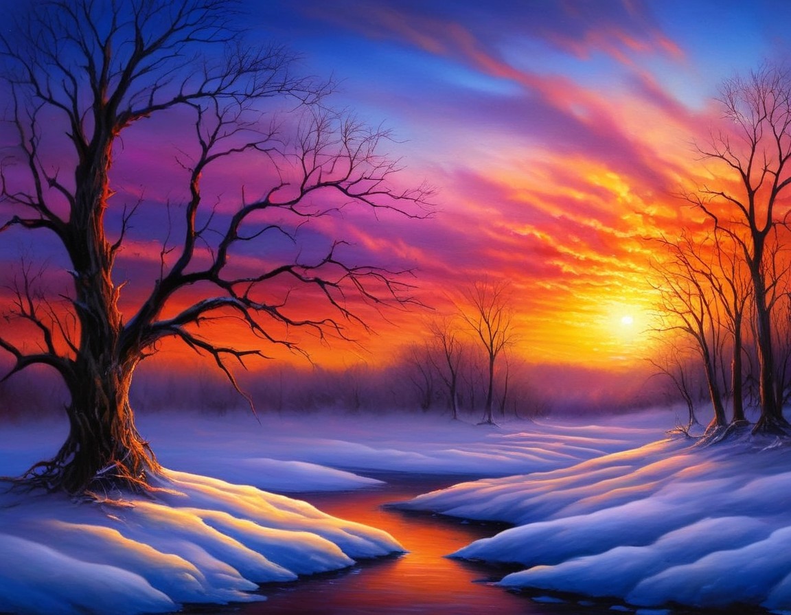 Surreal Winter Landscape with Sunset and Snowy Trees