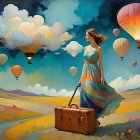 A woman in a flowing colorful dress stands on a sandy path, holding a suitcase. Vibrant hot air balloons float above her, set against a dramatic sky filled with clouds and distant mountains.