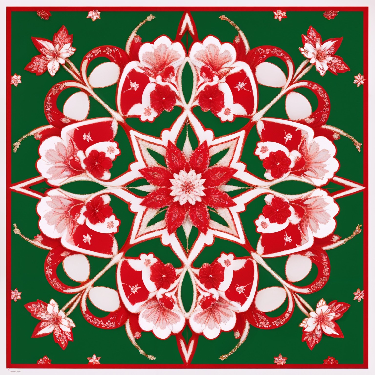 The image features a vibrant symmetrical pattern with bright red flowers and green foliage against a contrasting white background, creating a festive and decorative design.