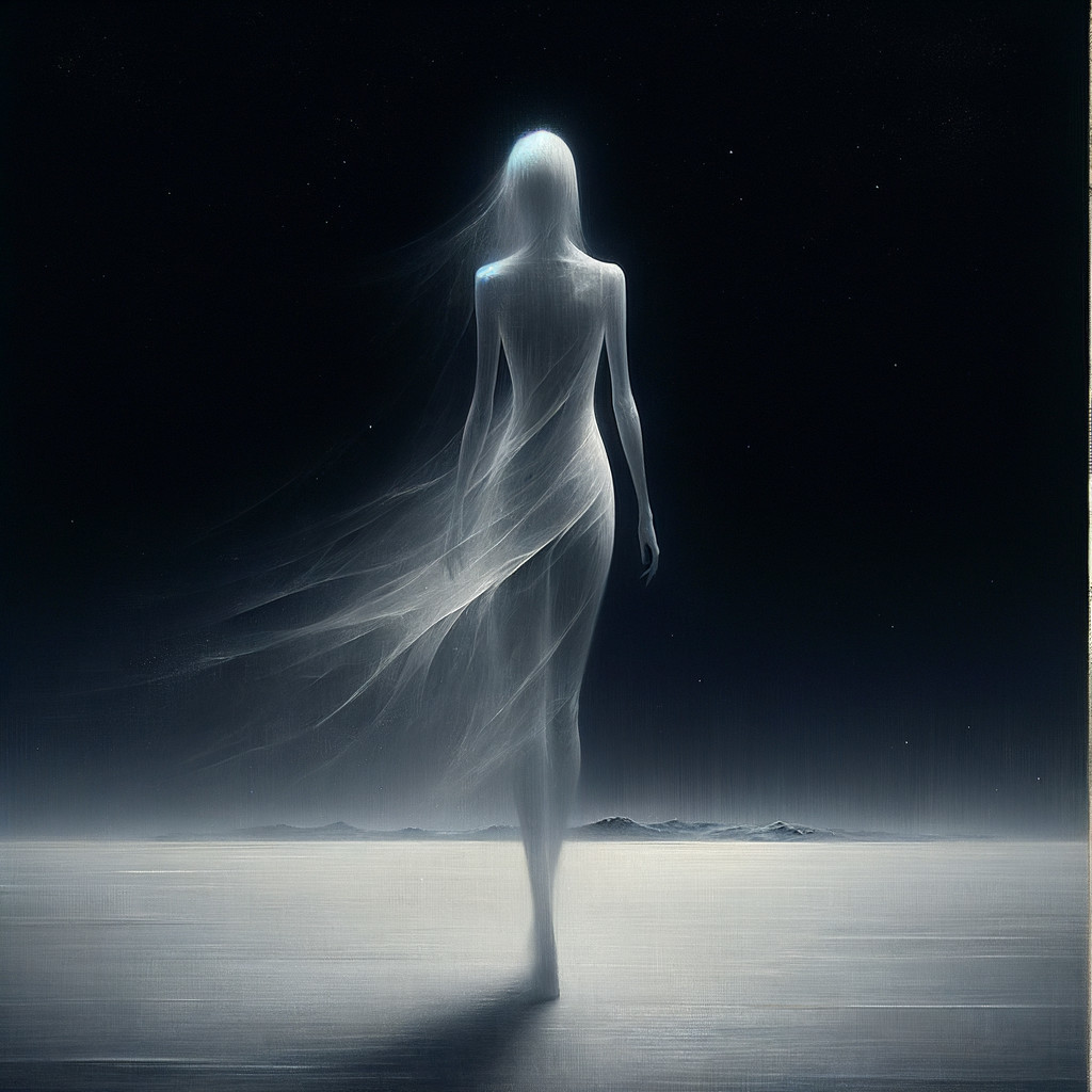 Prompt: "Ghostly thin lilliputian figure with ethereal wispy body dissolving behind her as she walks towards the viewer, milky translucent skin, thin arms and legs, vast open night sky, traditional Chinese ink painting style, emotional depth, sense of isolation, minimalistic white background, evocative brushstrokes, atmospheric perspective, serene and melancholic ambiance, dark void background, deep artistic concept, blurred depth of field, contemplative mood"