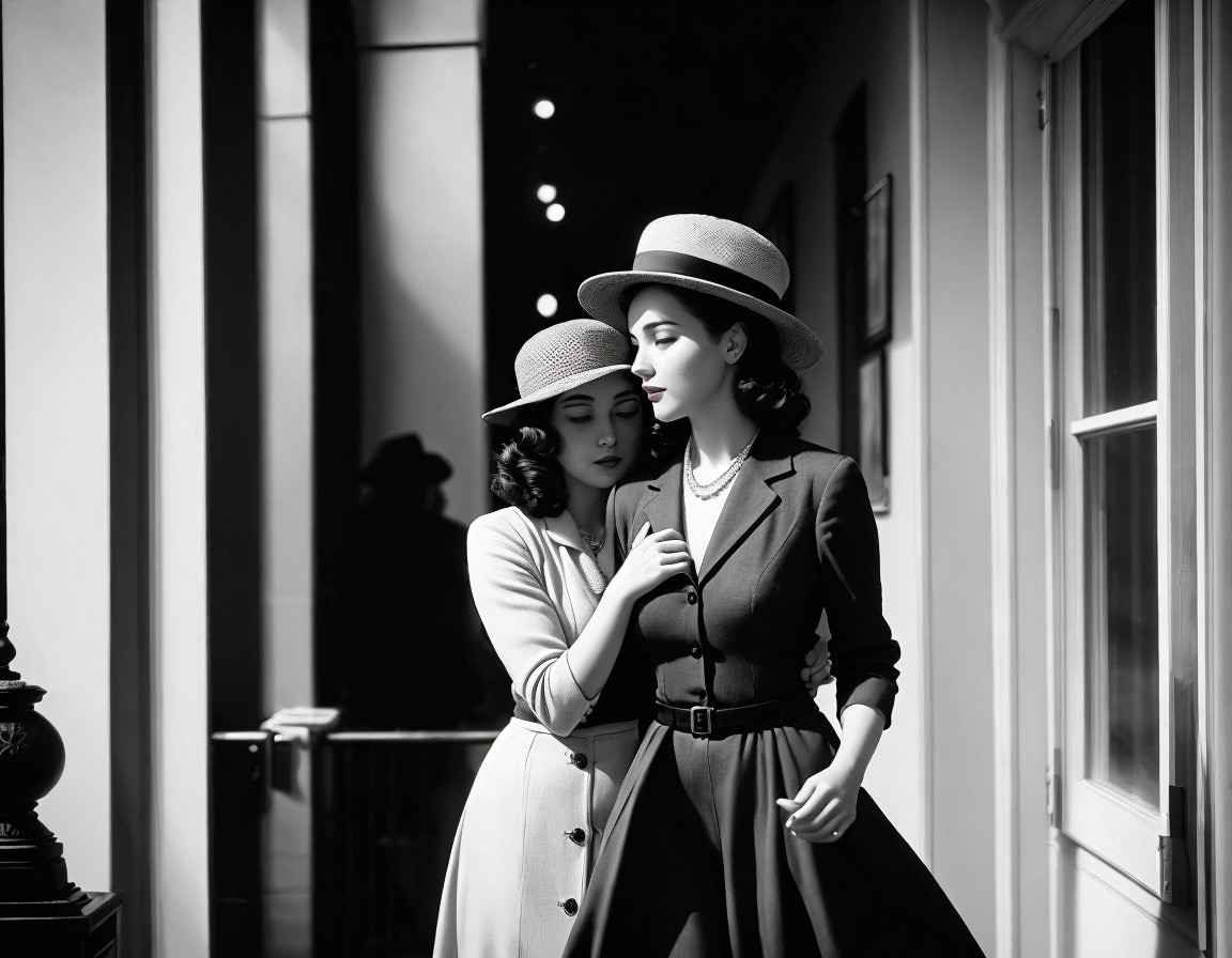 Prompt: "black and white picture, Vintage 1940s cityscape, reminiscent of Edward Hopper's style, two women walking arm in arm, hand in hand, lesbian lovers, deep shadows, cobblestone street, classic 1940s attire, hats, subtle expressions, urban setting, tall buildings with dimly lit windows, atmospheric perspective, black and white photography, high contrast, film noir aesthetic, elegant silhouettes, evening ambiance, mysterious and nostalgic feel, away from the camera angle, vintage street lamps, Art Deco architecture, moody lighting, silhouettes"
