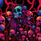 The artwork features a bold, surreal portrait of a woman with vibrant blue and pink hues, surrounded by colorful skulls and abstract shapes against a dark background, evoking a sense of eerie beauty.