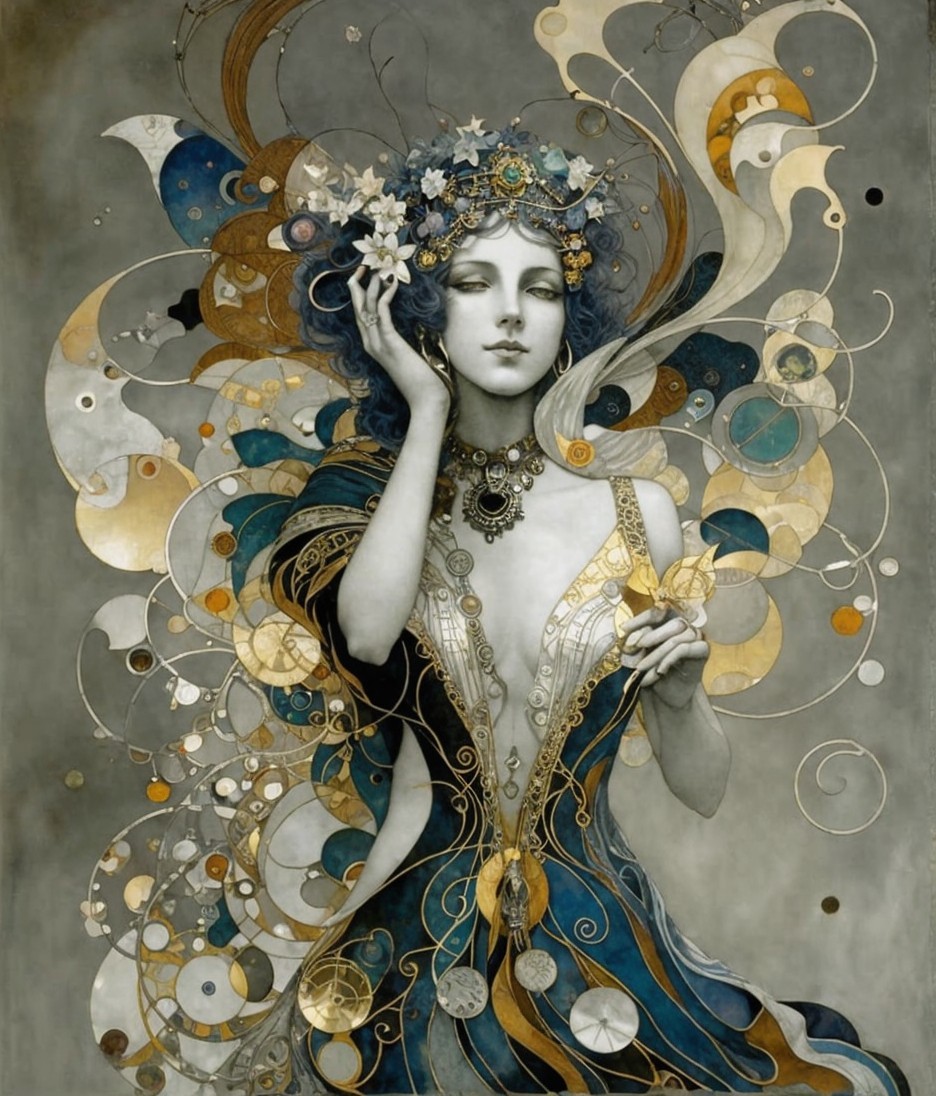 An elegant woman with intricate silver hair adorned with a decorative headpiece stands amidst swirling, ornate designs of gears and metallic disks, embodying a blend of beauty and artistry.