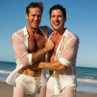 Two muscular men stand closely on a beach, both wearing unbuttoned cream-colored shirts. The ocean stretches behind them, reflecting a clear blue sky as they pose confidently.