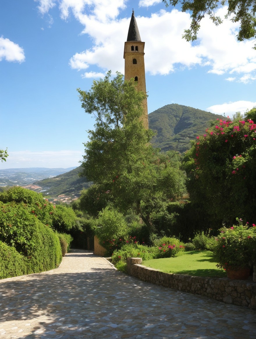 A serene landscape painting featuring a lush tree by a tranquil river, fluffy clouds in the sky, and a small house amid greenery in the distance.