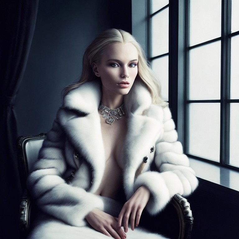 Prompt: "elegant women in fur coat sitting in a chair by the window, by Craig McDean, by Gottfried Helnwein, Urban fantasy, art photography, cgsociety, tumblr, Fine Art photo"