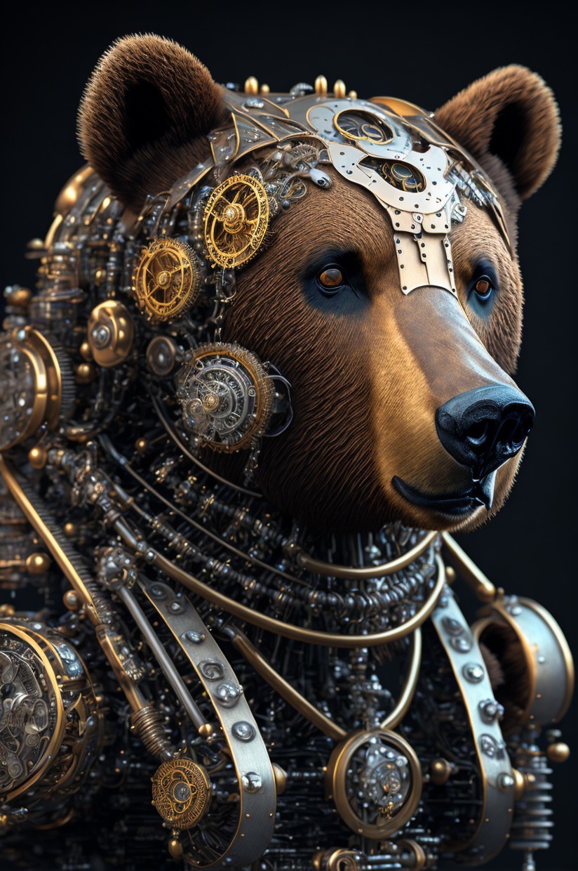 A realistic steampunk-style bear with intricate gears and mechanical details on its head and body against a dark background.