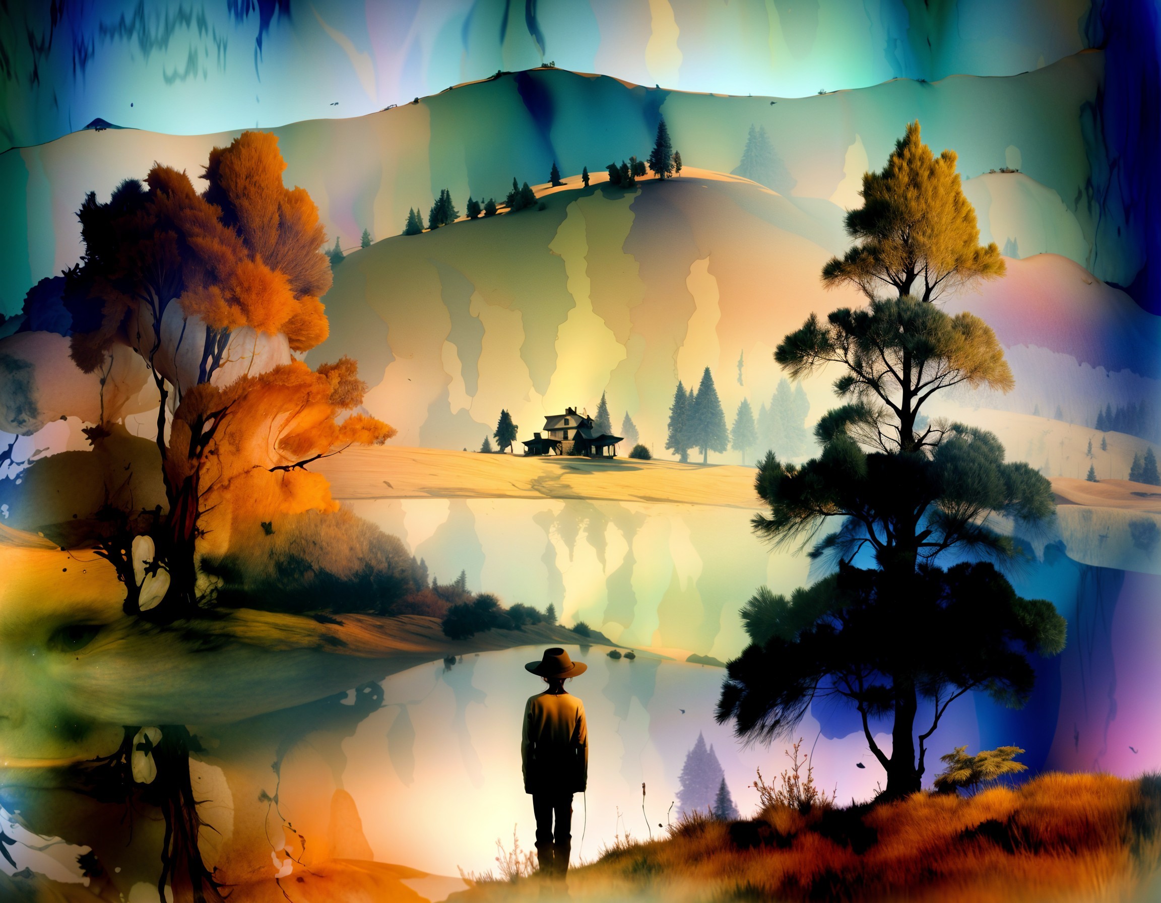 A tranquil landscape features a figure standing on an island amidst a serene lake, surrounded by vibrant trees and distant hills, with houses nestled in the distance.