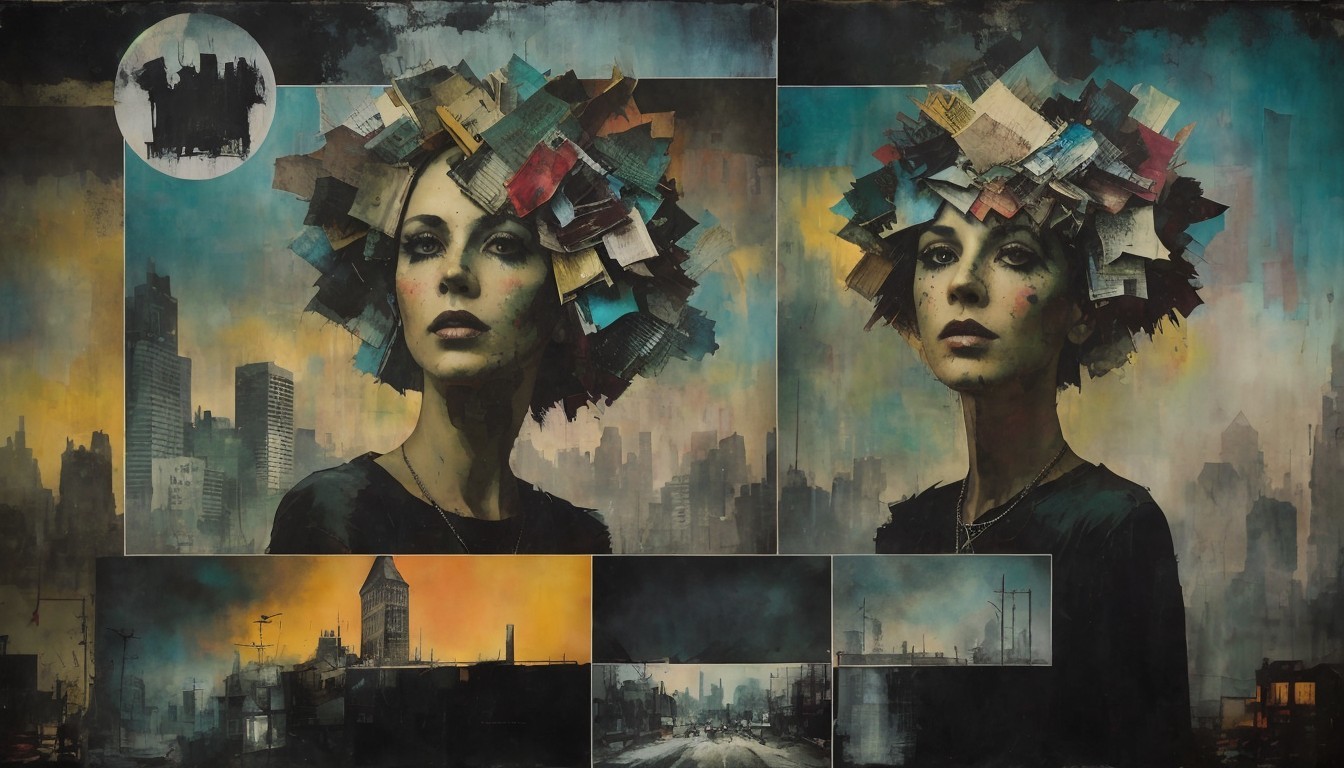+ Prompt:Mixed media collage with Bill Sienkiewicz's expressive brushstrokes and textures, blending traditional and digital media to create a unique, unsettling aesthetic. Cityscape. Distressed, grainy finish with high contrast colors, bold typography, and a vintage horror feel. Distressed paper texture, torn edges, faded ink, and eerie lighting evoke a sense of aged, forgotten terror. Incorporating the mixed media chaos and signature style of Bill Sienkiewicz, with bold colors and textures reminiscent of 70s and 80s horror movie posters, Ash Thorp's neon-lit grit, and the haunting, surreal landscapes of Zdzisław Beksiński"Illuminati is the machine. . Group of eyes. Blue pyramid of Green road into the framework building. paved path with black blocks of evil with eyes. People from the deep. H r. Giger machines. Angel eyes. Roads on skin tracks. Award winning photography, oil on canvas ,dynamic lighting, imperial colors ,quilling Marc Chagall Boris Vallejo Beksiński Stained Glass Horror themed By Dan Witz, Stephen Gammell, Rosina Wachtmeister ,Alfred Henry Maurer, Inspired by Hope Gangloff