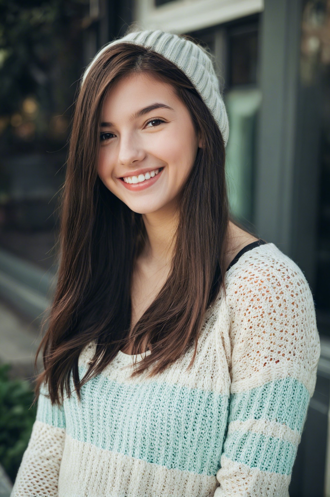 A smiling young woman with long, straight hair wearing a cozy cream and turquoise knitted sweater and a matching beanie, seated outdoors in a relaxed, cheerful pose.