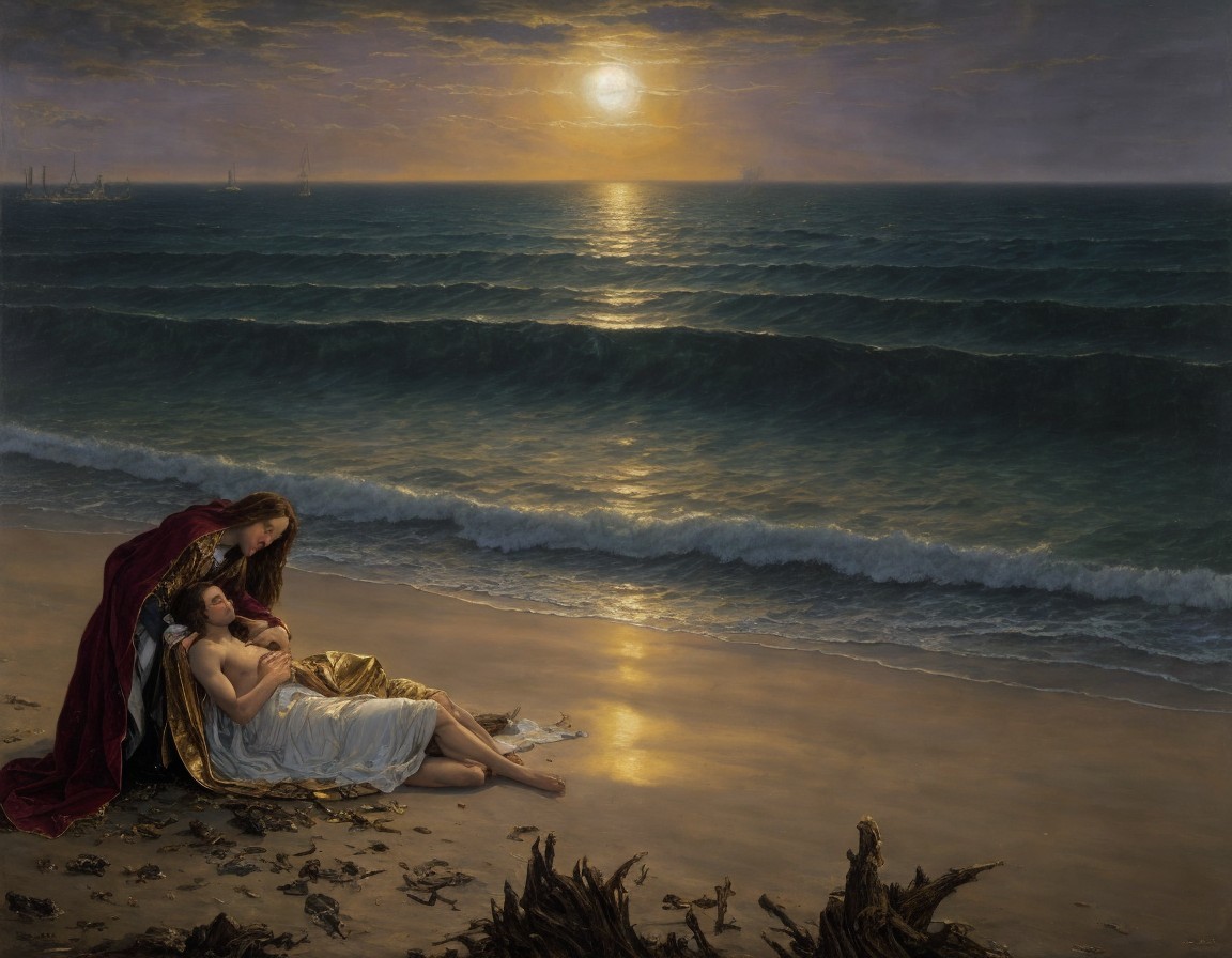 A painting depicting a dramatic beach scene with two figures at sunset, one comforting the other, amidst a serene ocean backdrop.