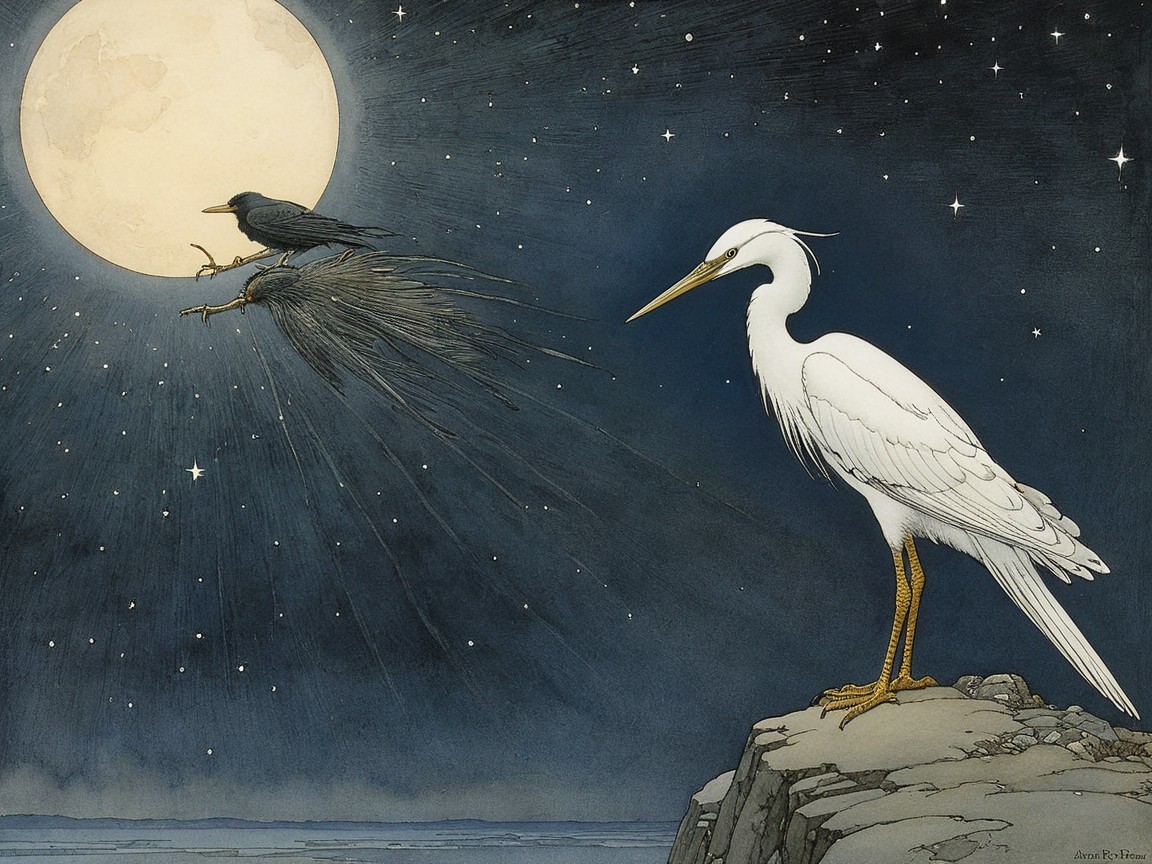 A serene night scene features a majestic white heron perched on a rock, gazing at a radiant full moon above a tranquil sea, surrounded by twinkling stars and a soft crescent moon in the distance.