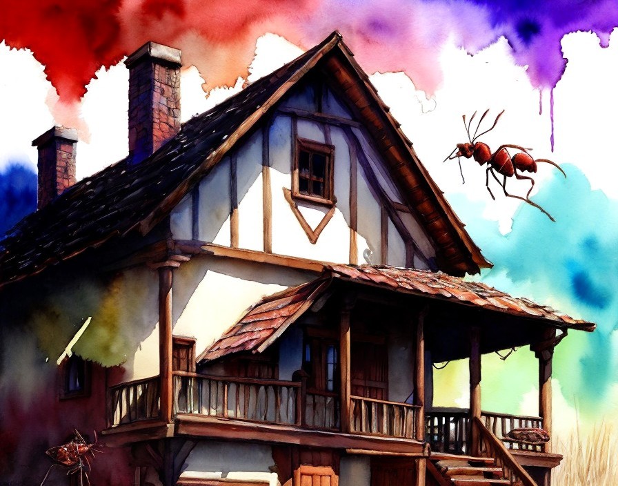 Illustration of a whimsical house with oversized ants crawling on it, against a colorful, splattered watercolor background.