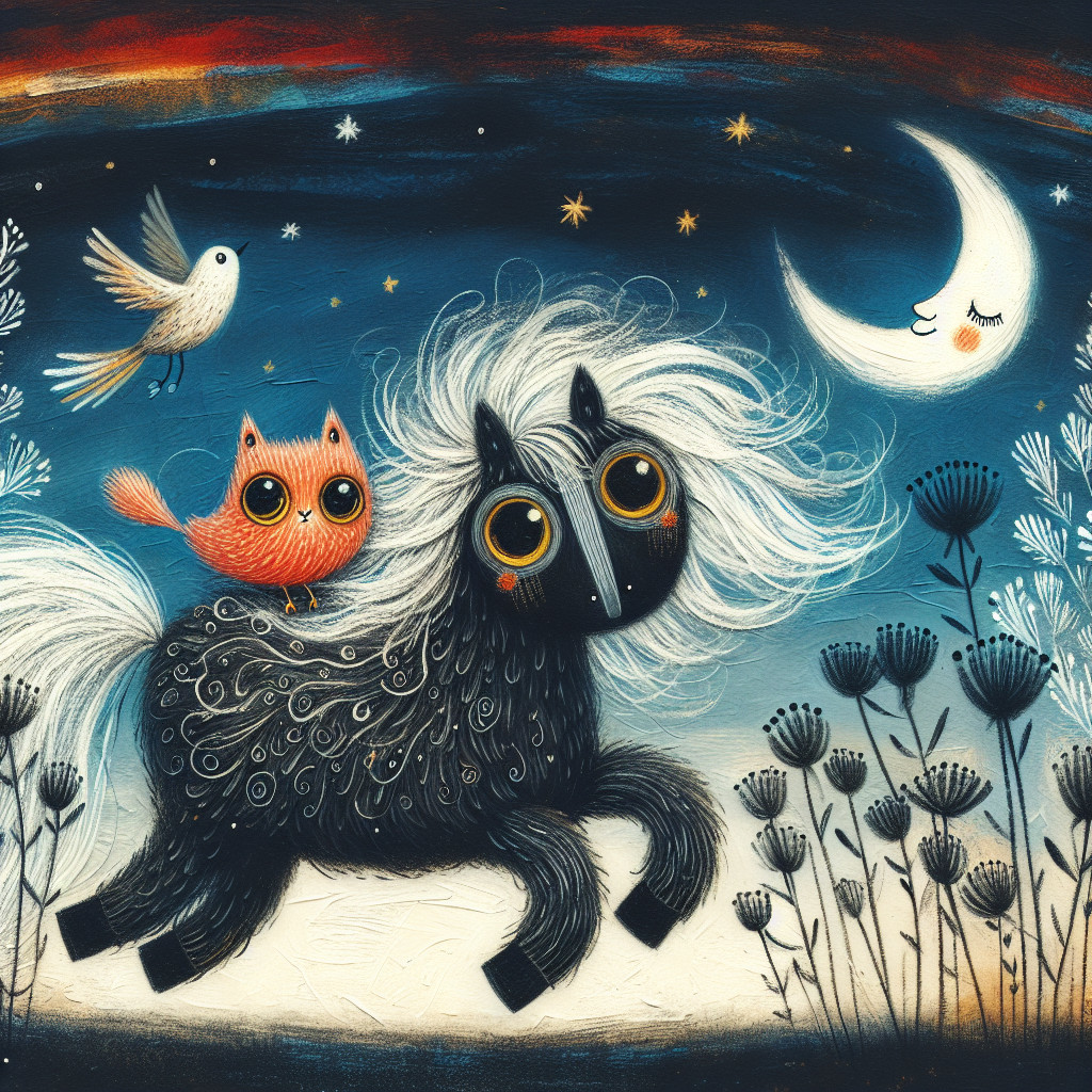 A whimsical illustration depicts a black pony-like creature with a flowing white mane and tail, large round yellow eyes, and an orange cat with big eyes perched on its back. The pony creature, adorned with intricate white swirls, appears to be in motion, possibly galloping. Above them, a white bird