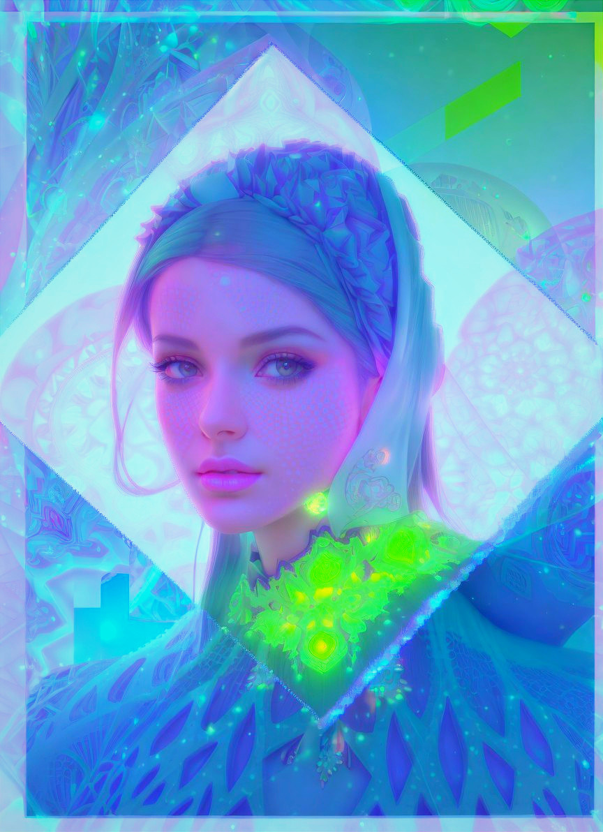 Prompt: Feminine futuristic portrait, double exposure effect with fractals and mandelbrot shapes, fluorescent, phosphorescent, blending geometrical elements with bold lineage and fractals, moiree effect, geometrical 3D effects, parallax occlusion, stacked lines, fractals overlay. Incorporate intricate patterns, warm 3 point lighting, dyed by Man Ray, line-art, thick textured layers, contoured, tactile feel, fractalized features, intricate detailing, warm coloring enhancing the fantasy ambiance, stacked lines, close-up, sgrafitto reminiscence, brightness 1.5, visible textures, quaint, fusion of geometrical styles with detailed line art to create psychedelic ambiance, hatching details and a soft, atmosphere, cymatics elements, precise execution. Stacked lineage by Stan Lee and Ho Baron and William Bradley, cymatics, mandelbrot shapes, estranged crimson red hues, deep cobalt blue shades, warm grey accents, color gradient, abstract swirls, blending colors seamlessly, digital painting, high resolution, intricate details, dynamic lighting effects, reminiscent of pop art, infused with a 1970s retro design twist. Detailed psychedelic style,metallic textures, holographic elements, harsh coloring, retro-futuristic touch of surrealism. Illuminate with vibrant and contrasting colors, emphasizing shadows and highlights, creating a visually striking composition, collagraphy, great depth and scale, tousled scene, delicate tones in a indiecore style, angled, stylized micro-pen lines with exaggerated features, hues by Ed Binkley, rough paint accentuating her features, color palette of light-yellow light green dark-pink, golden hour, abstract, structured, smeary, linocut reference, onfident smirk face, intensive perspiration, rough strokes, messy ink stroke lines, black brushstrokes adding depth, simplistic color scheme, op-art inspired by Georges Seurat and Ho Baron.