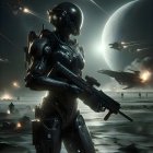 In the desolate expanse of the lunar surface, amidst a chaotic theater of war, strides a lone figure—a futuristic female soldier adorned in imposing, mechanical armor that exudes both menace and technological prowess. This armored behemoth, a harbinger of advanced warfare, stands unrivaled amidst the relentless onslaught of battle.Clad in a formidable exoskeleton, the soldier embodies the epitome of tactical superiority. The armor, an amalgamation of sleek design and impenetrable resilience, forms an imposing silhouette against the bleak lunar landscape. Its surface, a seamless sheath of obsidian alloy, reflects the eerie glow of distant explosions and the haunting luminescence of alien weaponry.The soldier's helmet, a masterpiece of futuristic engineering, encases their head in a sleek visage of cutting-edge technology. Within its confines lies a heads-up display that projects tactical overlays and vital information, enhancing the soldier's situational awareness amidst the chaos of war.In one hand, the soldier wields a futuristic rifle—a weapon of unparalleled sophistication that hums with lethal energy. The rifle, an epitome of destructive precision, emits vibrant pulses of energy, capable of obliterating enemy targets with surgical accuracy across the lunar battlefield.Around the soldier, the lunar surface trembles with the impact of incoming bombs, their detonations casting plumes of lunar dust and debris into the air. Spaceships, locked in a deadly skirmish overhead, unleash torrents of energy beams that streak across the sky, illuminating the lunar terrain in a mesmerizing display of cosmic warfare.Yet, amidst this maelstrom, the soldier charges forward with unwavering determination, their mechanical armor a bastion of impenetrable defense. Anti-tank missiles, mere nuisances against the formidable armor, bounce harmlessly off its surface, a testament to its imperviousness against conventional weaponry.