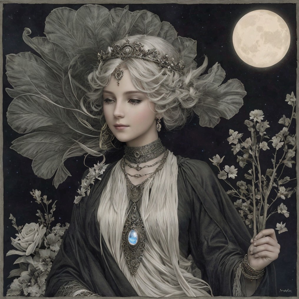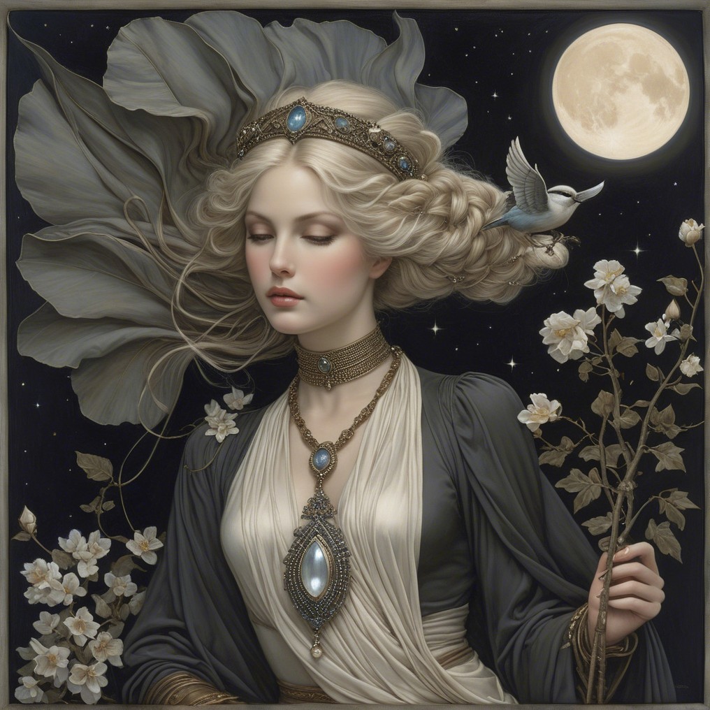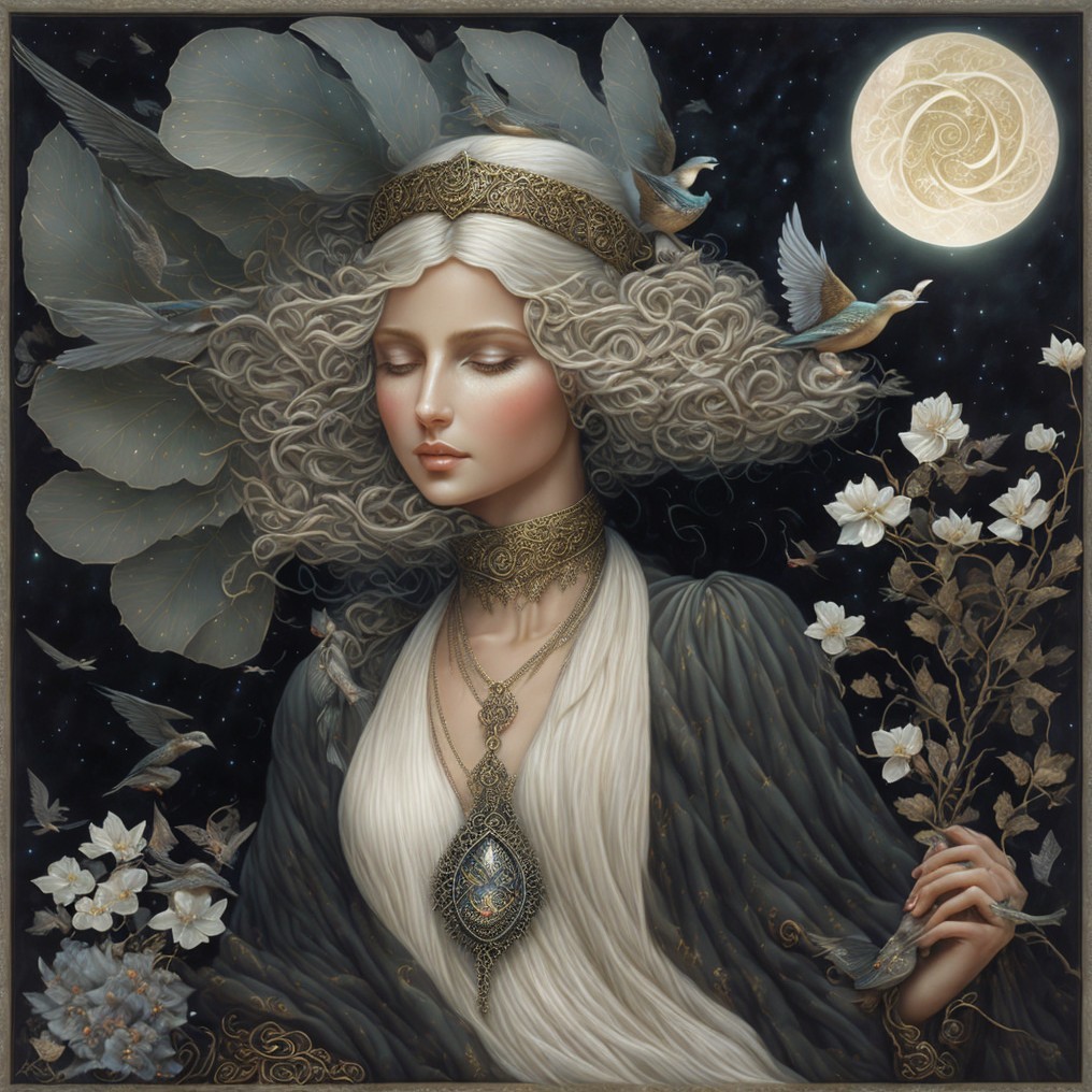 A serene figure adorned with jewels and flowing garments is surrounded by white doves. She has long, flowing hair and a moonlit backdrop, creating an ethereal, mystical atmosphere.