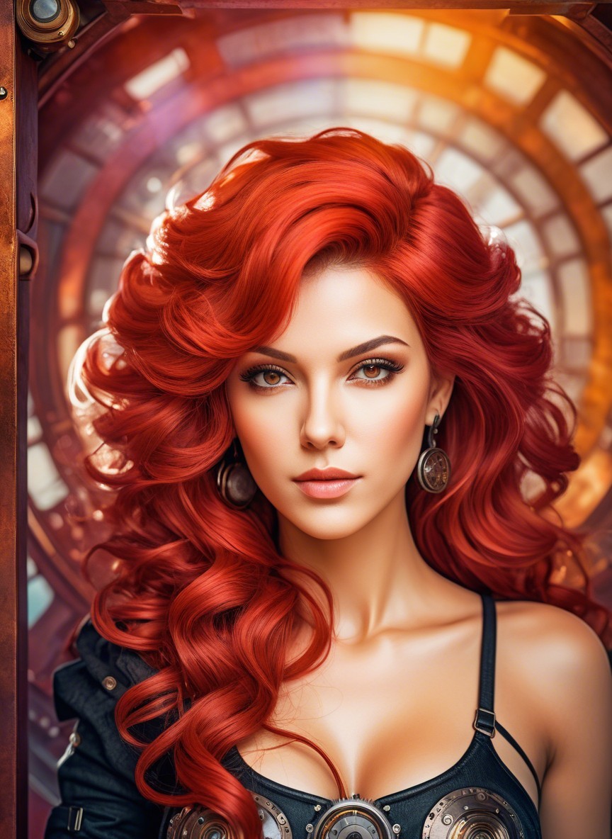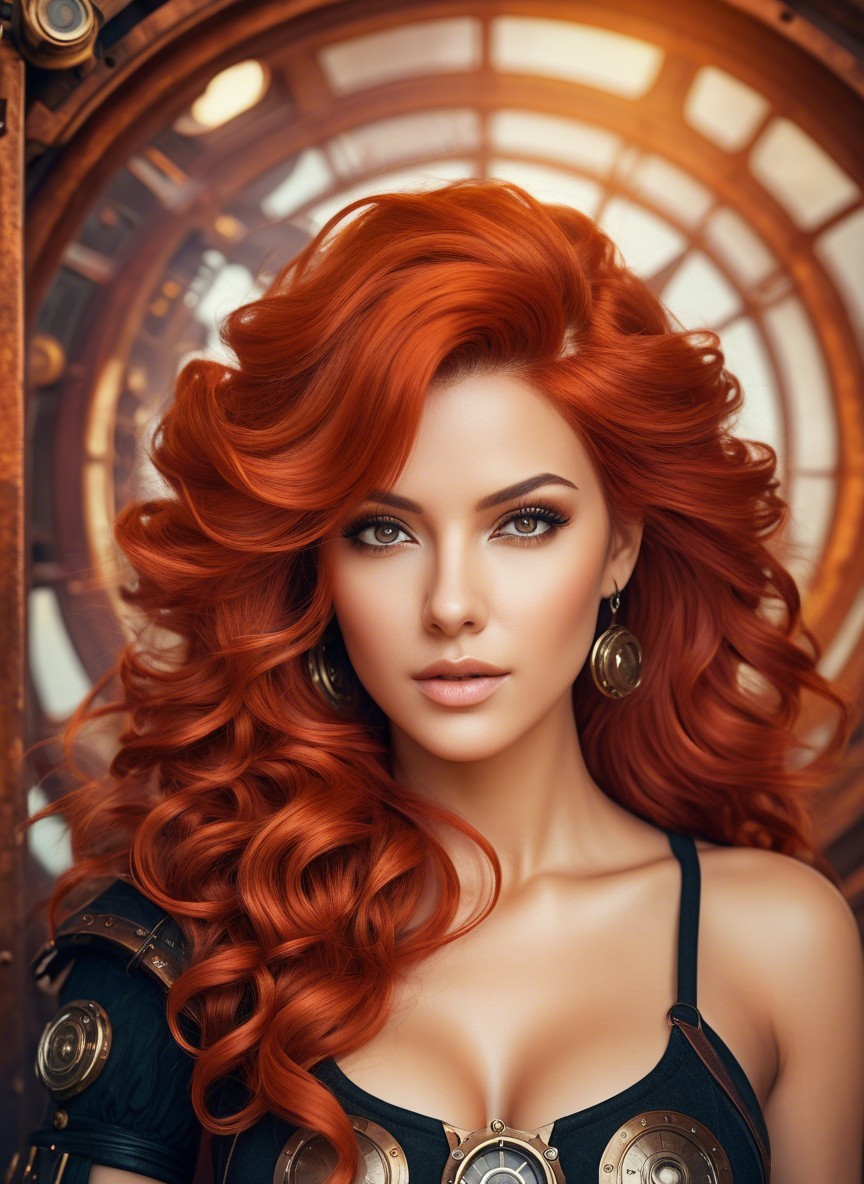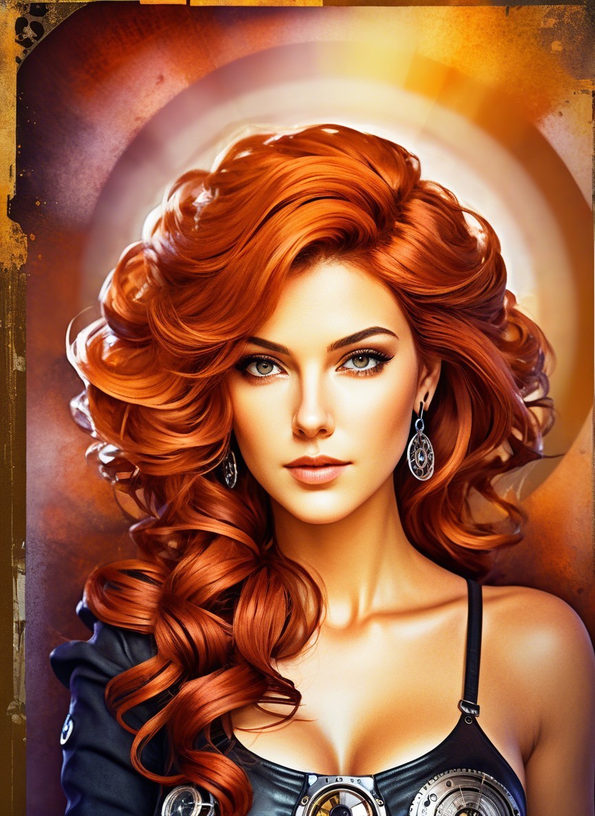 A striking woman with voluminous red curls gazes confidently, adorned with elegant earrings. She wears a stylish outfit that hints at a blend of fantasy and vintage aesthetics, set against a dramatic backdrop.