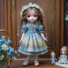 A beautifully crafted doll stands gracefully in a picturesque setting with a horse nearby. She wears a charming pale blue dress adorned with lace, surrounded by soft flowers and a serene backdrop.