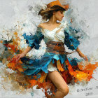 A vibrant watercolor illustration of a woman in a playful off-the-shoulder dress. The dress features a mix of blue, orange, and white hues, accentuating her graceful pose and elegant style.