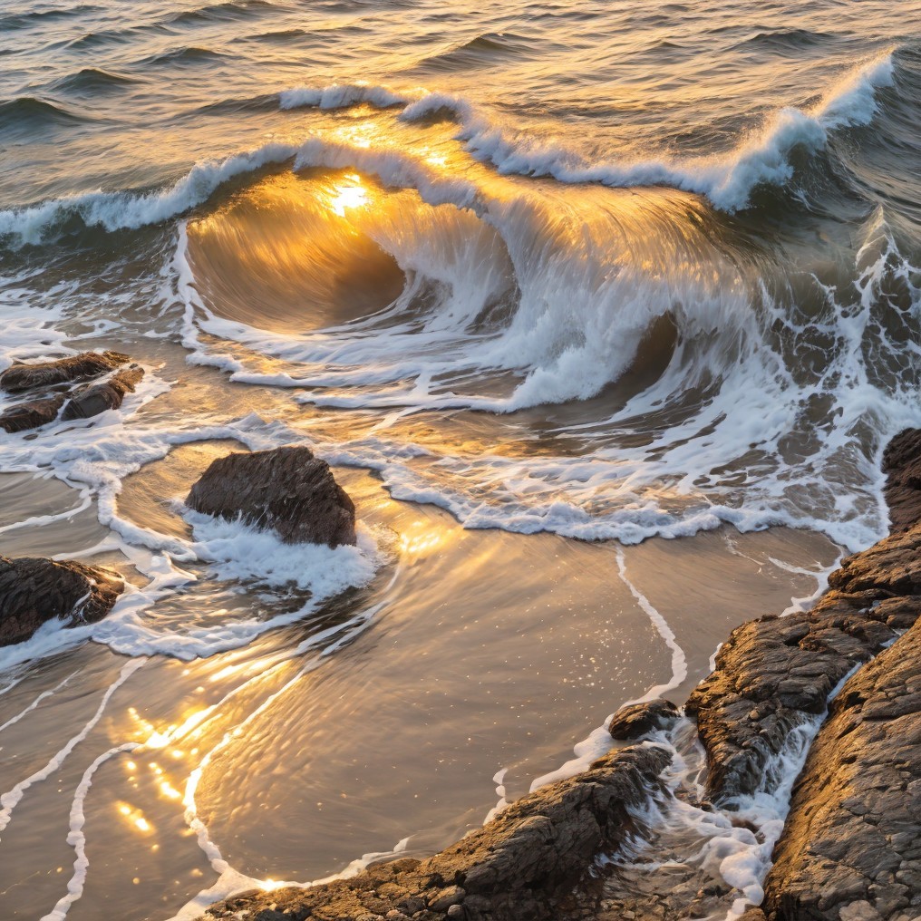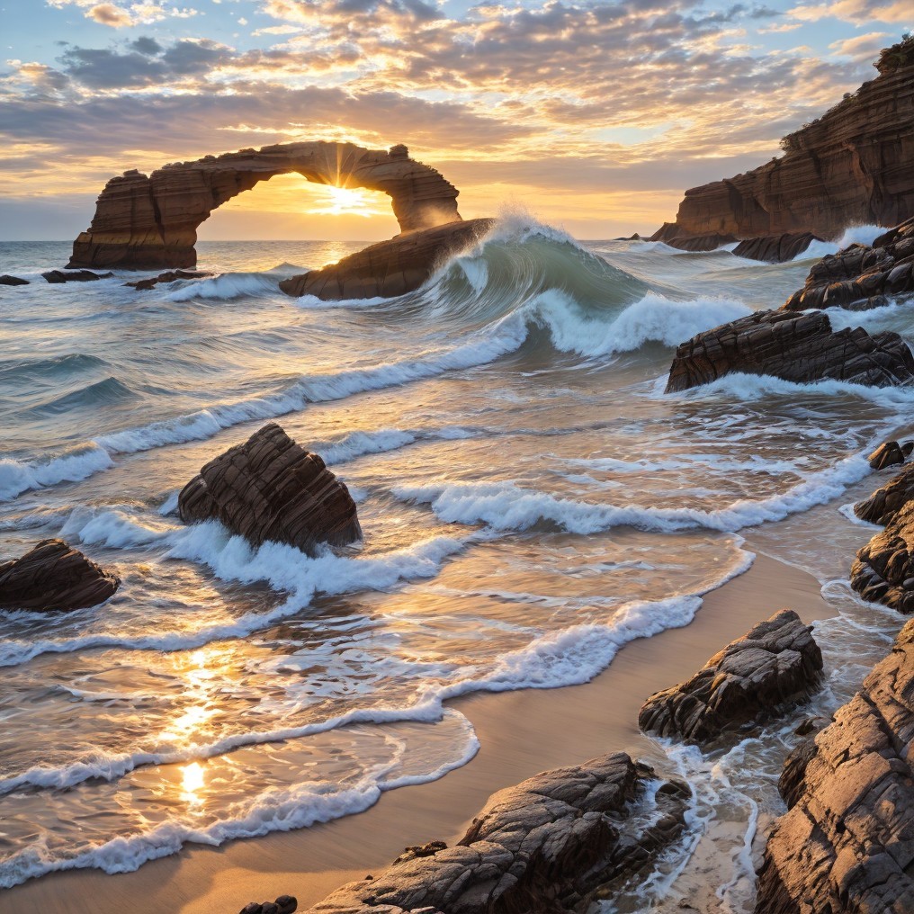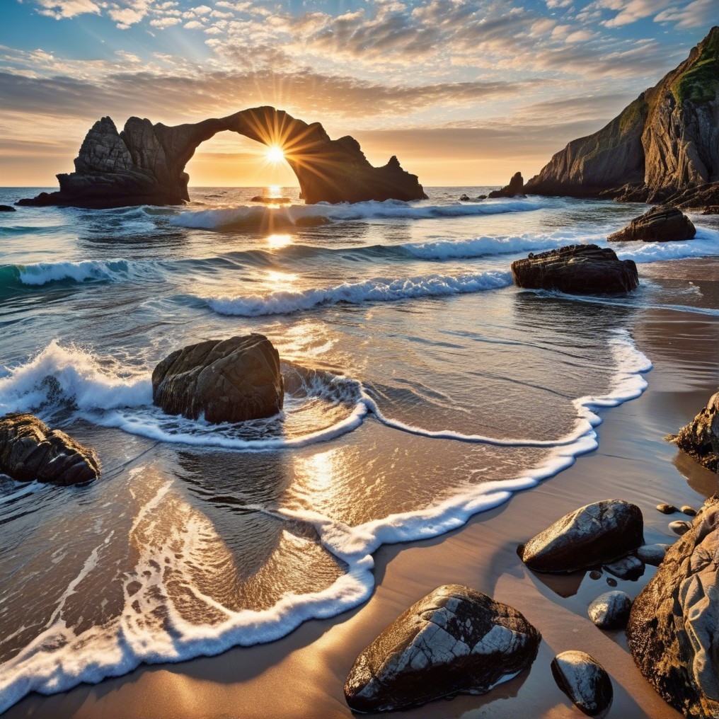 A stunning beach scene featuring a large rock arch with the sun setting behind it, casting golden rays. Gentle waves lap at the shore, with smooth stones scattered across the sandy beach.