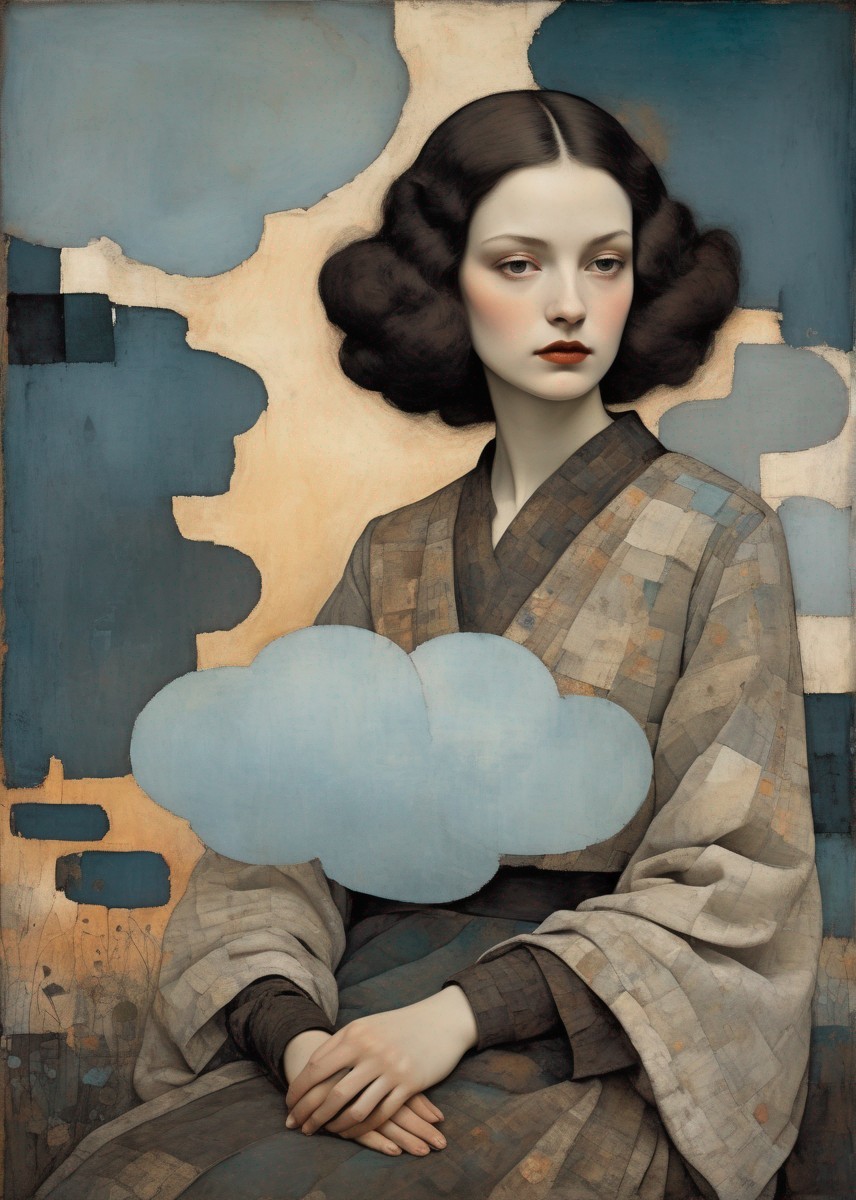A painting of a woman with dark hair, seated, against a geometric blue and gold background. She wears a vintage blouse and has a contemplative gaze.