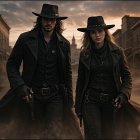 A wide shot shows a couple, a man and a woman, dressed in black cowboy attire, walking side-by-side down the dirt main street of a desert wild west town. The man, on the left, has long black hair and a beard, and wears a wide-brimmed