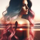 Surreal Scene of Woman with Pink Hair by Ocean at Sunset
